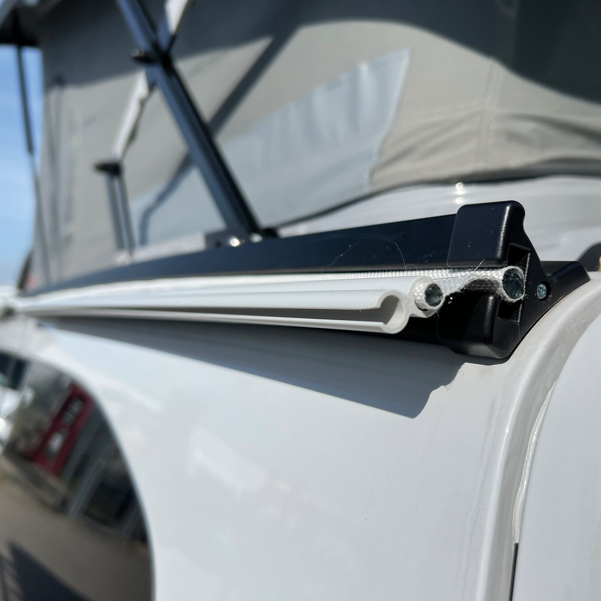 Adapter zwischen Crosscamp-Schiene und Vorzelt. Im Lieferumfang enthalten ist ein 9 mm Keder-Profil, um ein freistehendes Busvorzelt an ein Fahrzeug mit einer werkseitig montierten Crosscamp-Kederschiene anzuschließen. Verbindet Ihr Busvorzelt mit Ihrem Fahrzeug.