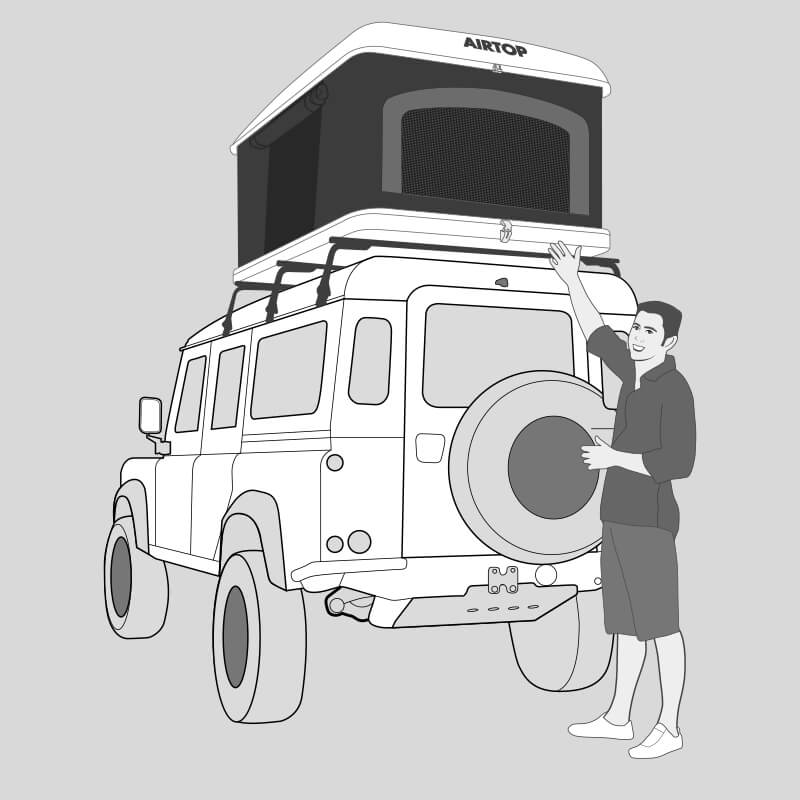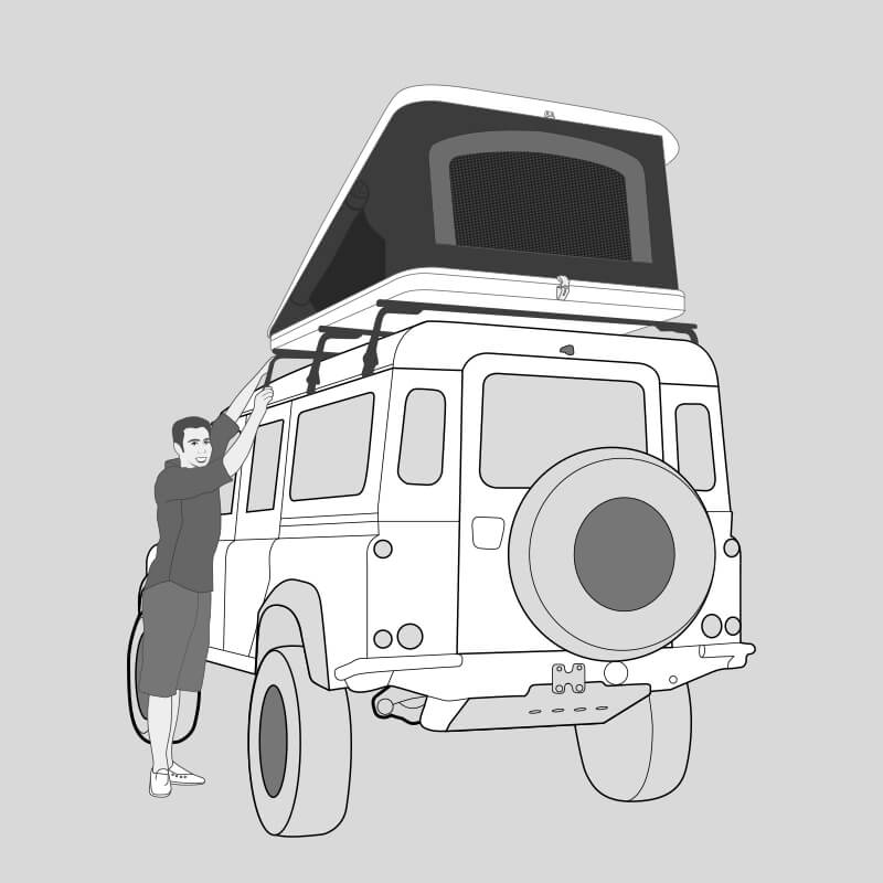 - Boden: „Sandwichstruktur“ mit zwei Stahlschienen. 4 integrierte Handgriffe ermöglichen ein einfaches Bewegen des Dachzeltes.