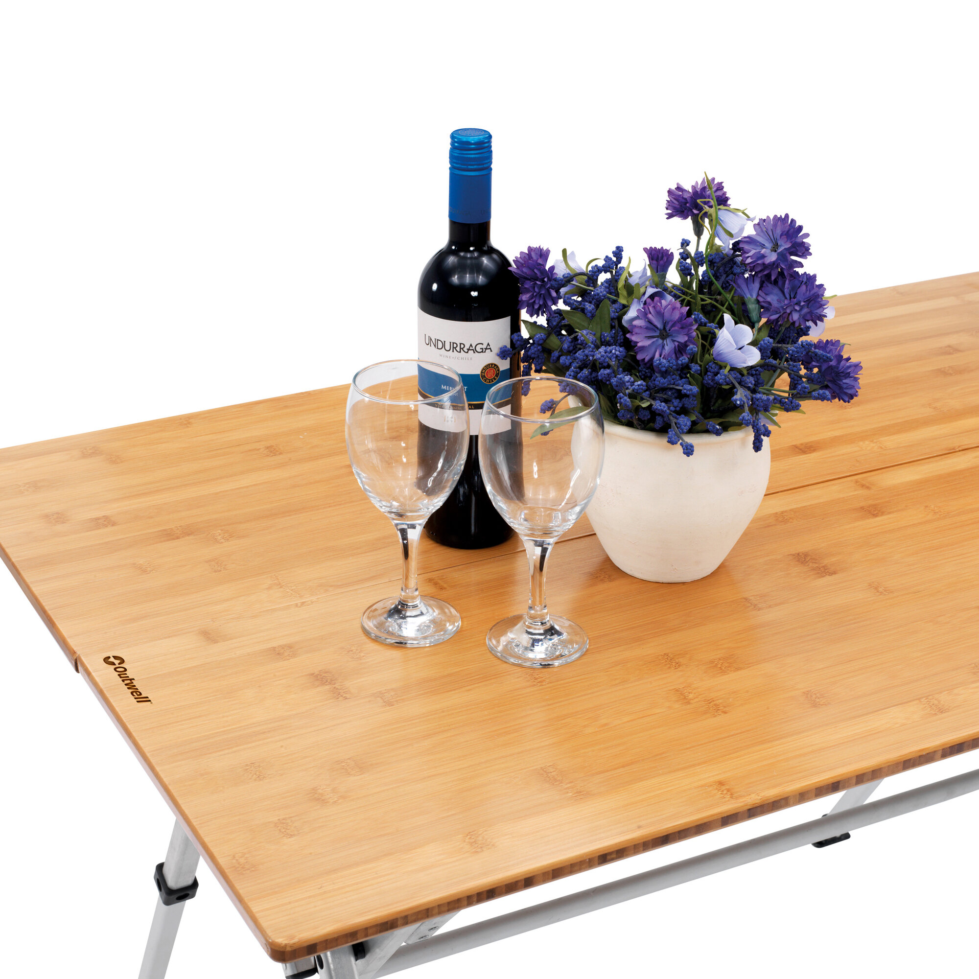 Stilvoller Tisch in modernem Design. Gefertigt aus langlebigen Materialien, ausgestattet mit strapazierfähiger Bambustischplatte und Aluminiumrahmen. Sekundenschneller Auf- und Abbau. Praktische Griffe ermöglichen bequemen Transport. Kleines Packmaß. Verstellbare Füße.
