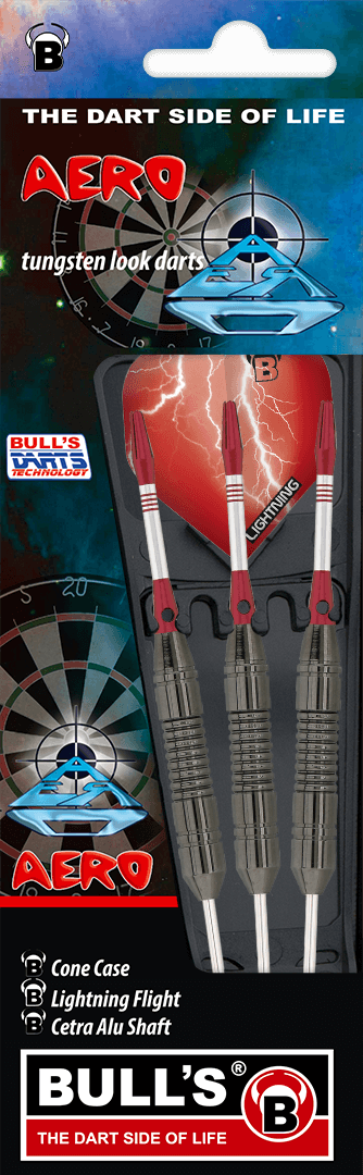 Der Aero aus Messing ist mit seiner dunklen Chrom-Beschichtung der schöne Einsteiger-Dart im Tungsten Design. Das Barrel verfügt über einen guten Grip. Im handlichen BULL'S Cone Case mit Cetra Aluminium Schäften und Lightning Flights.