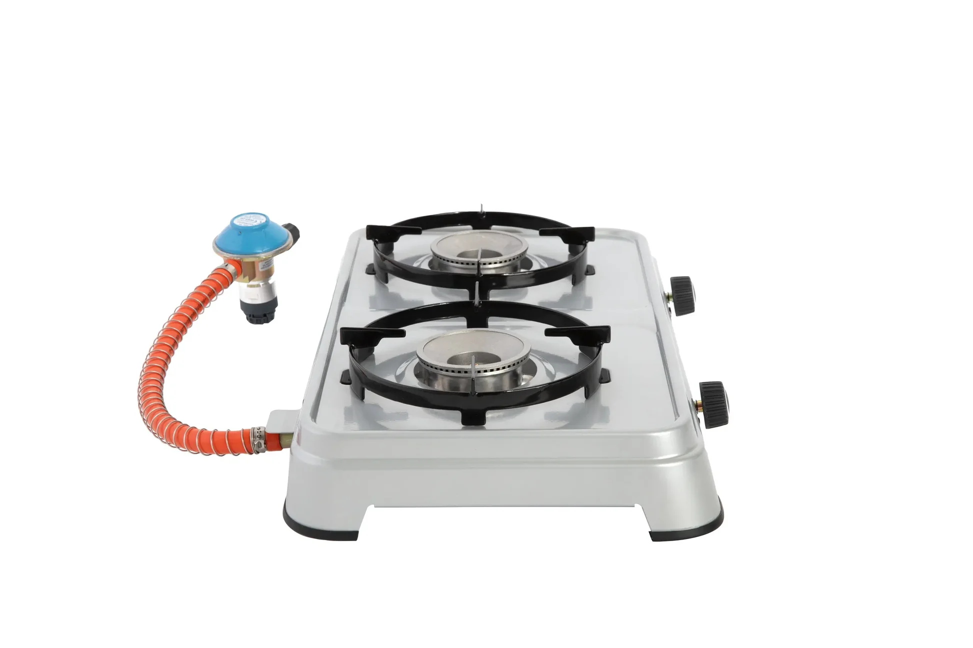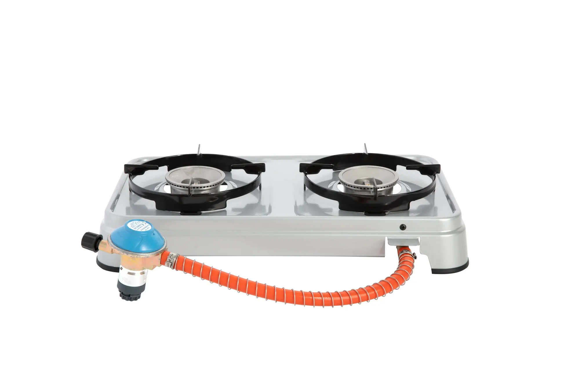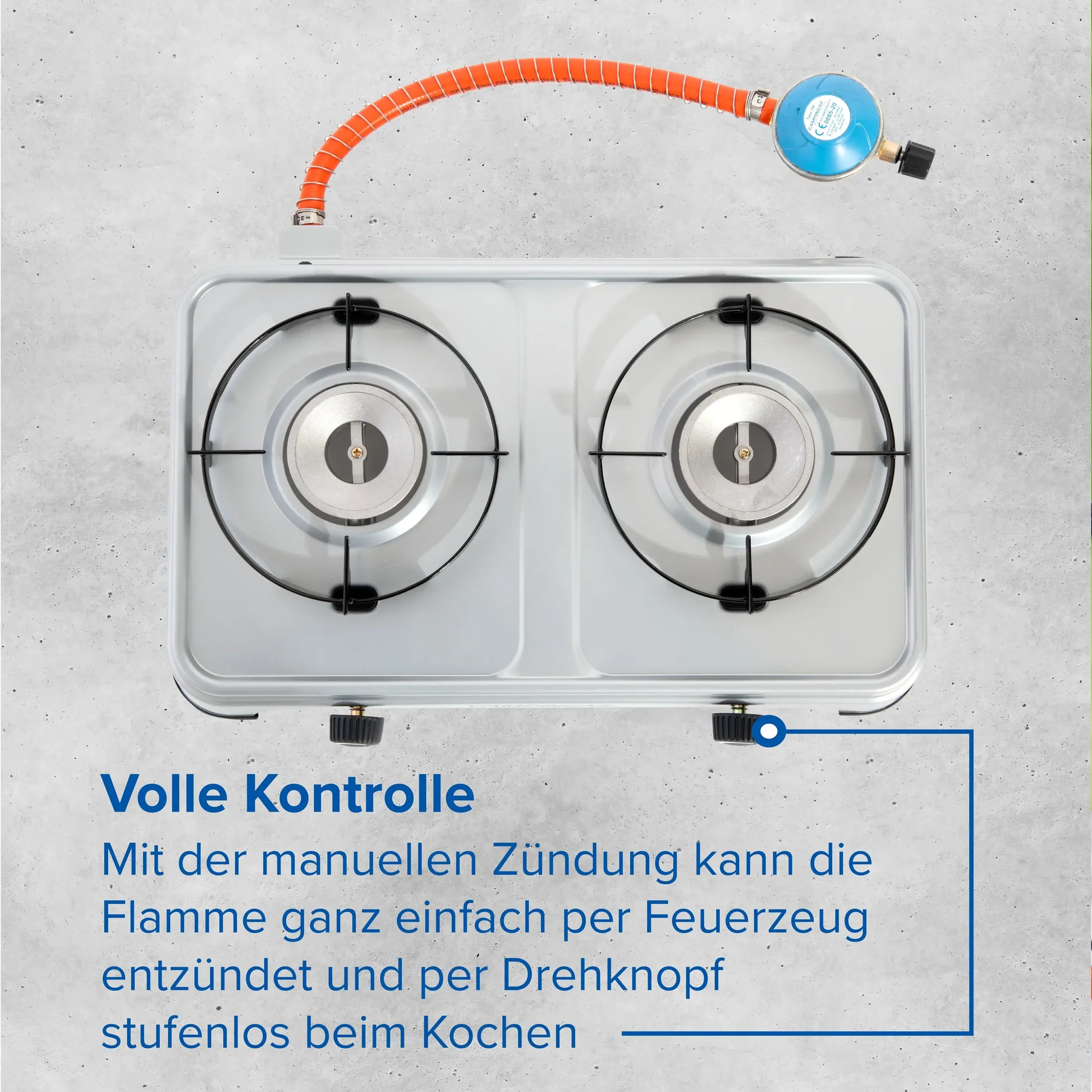 Der Schlauch und Gasregulator für die Easy-Click Plus Kartuschen ist bereits enthalten. Die zwei herausnehmbaren und spülmaschinengeeigneten Topfträger lassen sich leicht reinigen.