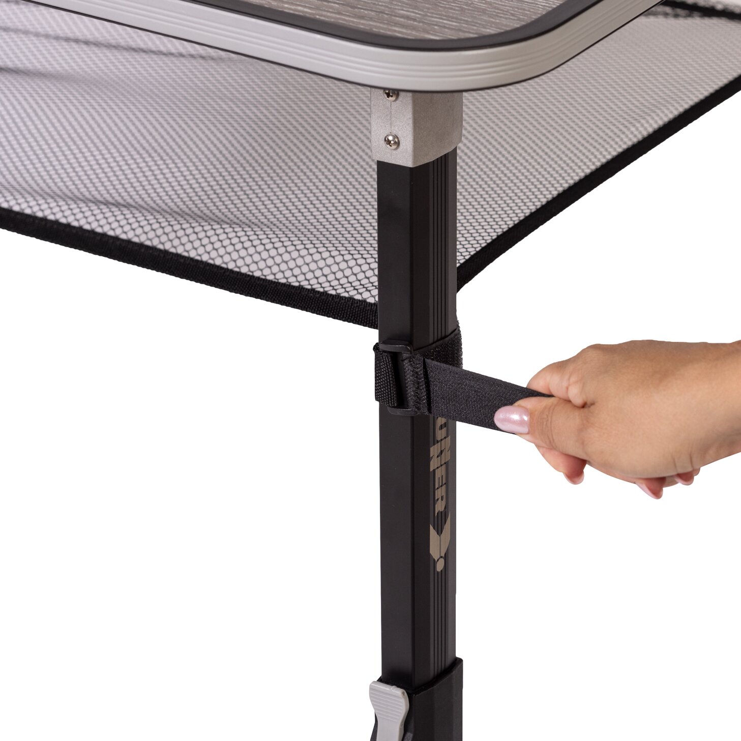 Wie der Elútop ComPack punktet der ComPack NG mit einer ultraleichten, klappbaren Tischplatte, hoher Stabilität und platzsparendem Design. Dazu ist er langlebig, wetterbeständig und leicht zu transportieren. Neu sind die praktische Netzablage und die Tischbeinprofile mit stufenloser Präzisionsverstellung.