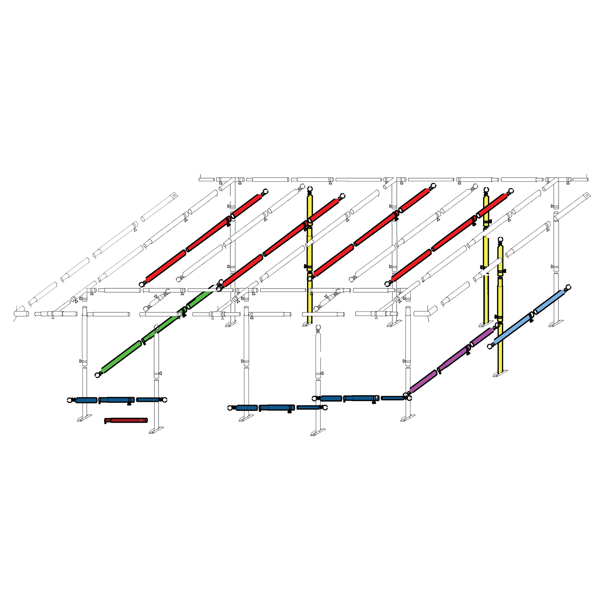 Gestänge: ø 32 mm Stahlgestänge (5 Dachstangen, 8 senkrechte Stangen, Vordachgestänge).