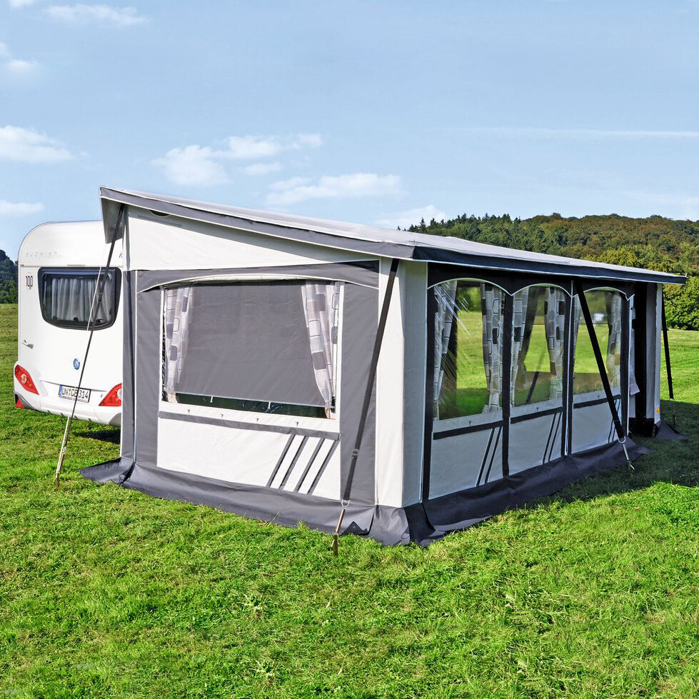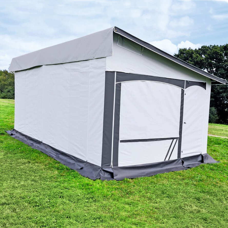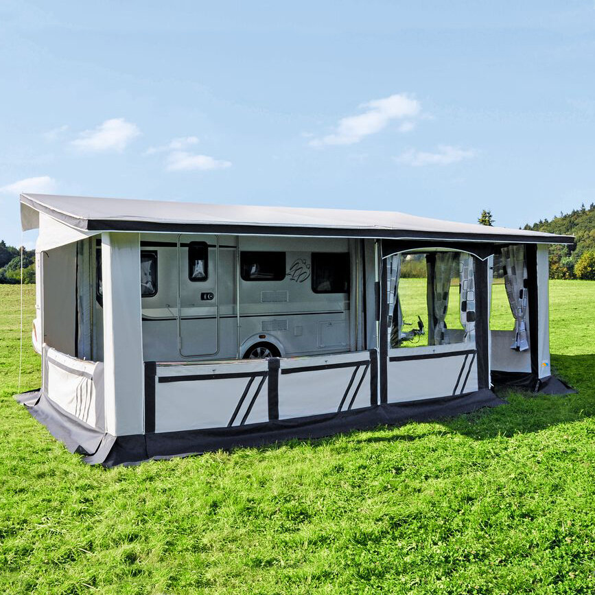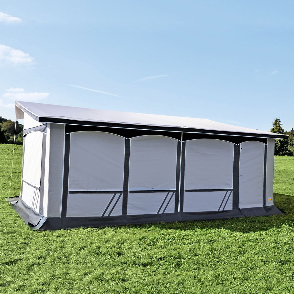 Das freistehende, wetterfeste Vorzelt ist komplett aus PVC. Ein doppelter Erdstreifen mit angenähtem Keder ermöglicht es, spezielle Abspannhaken nach Wunsch zu verschieben. Hohlsäume am Vordach und innen unter den Fenstern sowie Sturmleisten unter allen Fenstern außen ermöglichen eine zusätzliche Gestänge-Montage (Sturmgestänge). Alle Fensterklappen lassen sich mit einem Reißverschluss verschließen. Dreiseitiger Dachüberstand ca. 25 cm und 40 cm breite Überwurflasche, längsseitig zur Fahrzeugwand. Mit sechs bereits montierten Sturmclips (Sturmgurte optional erhältlich).