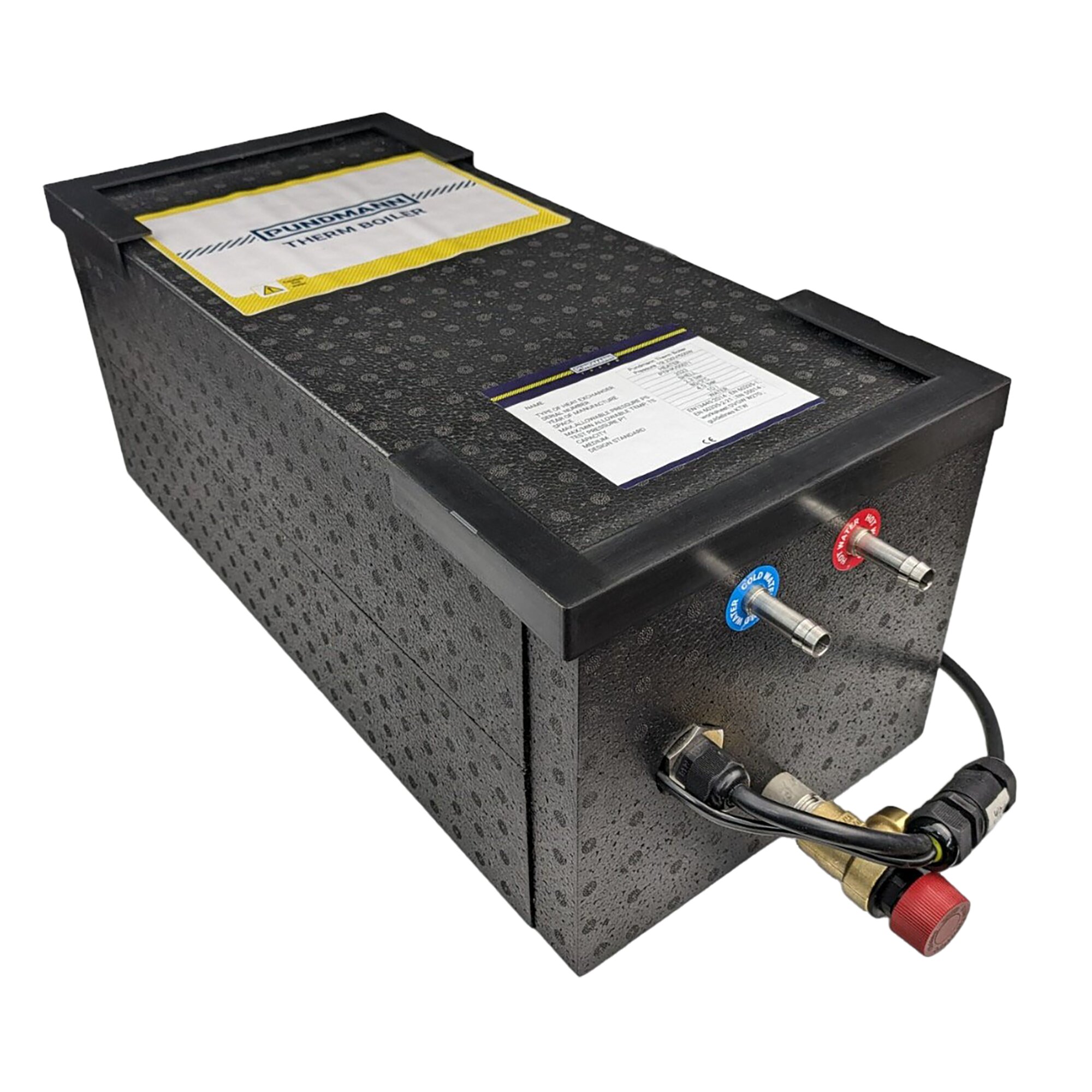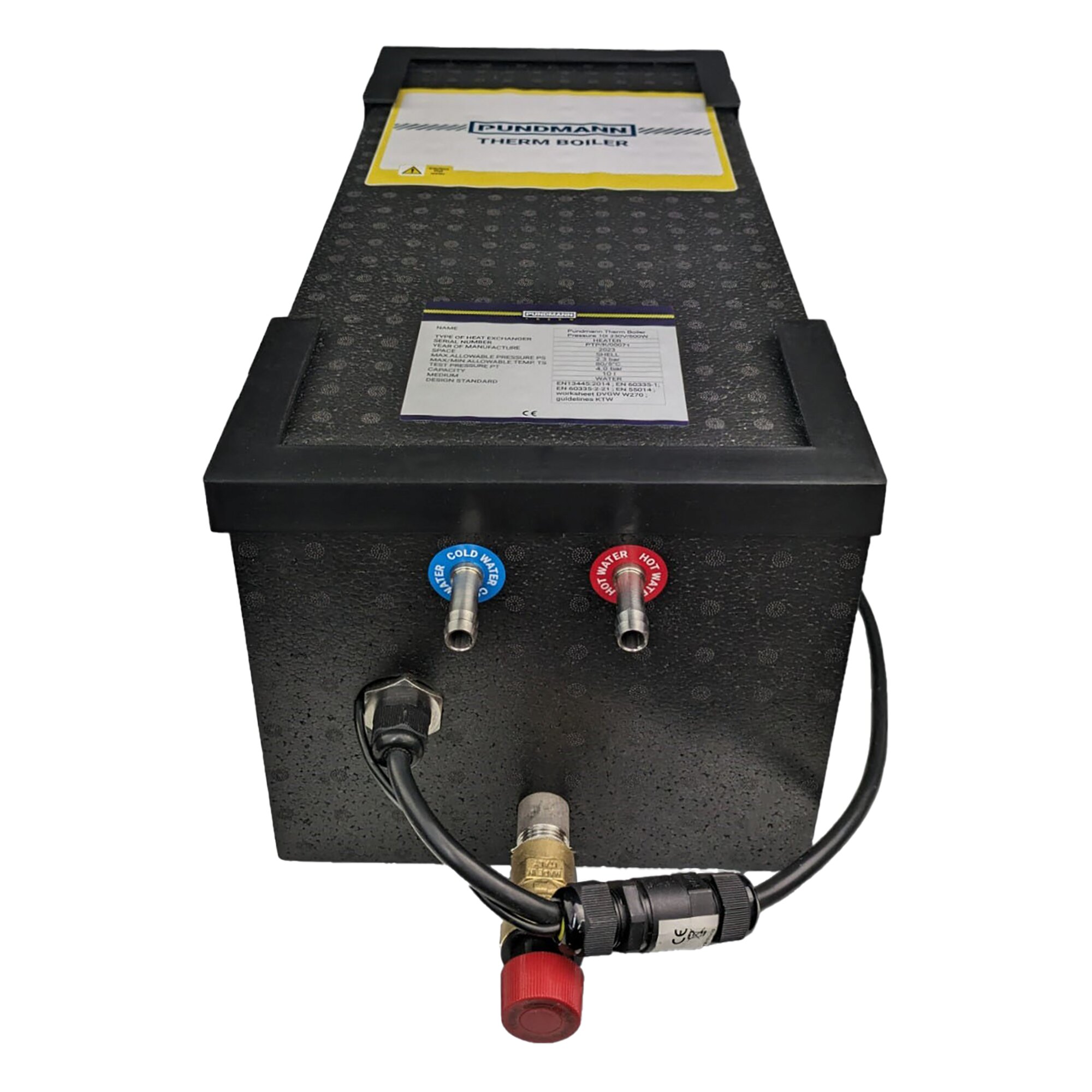 Technische Daten: Aufheizzeit: ca. 75 min./75 °C; Wasseranschluss ø 10 mm. Betriebsdruck: 2,3 bar; Einstellung des Sicherheitsventils: 3,0 bar.