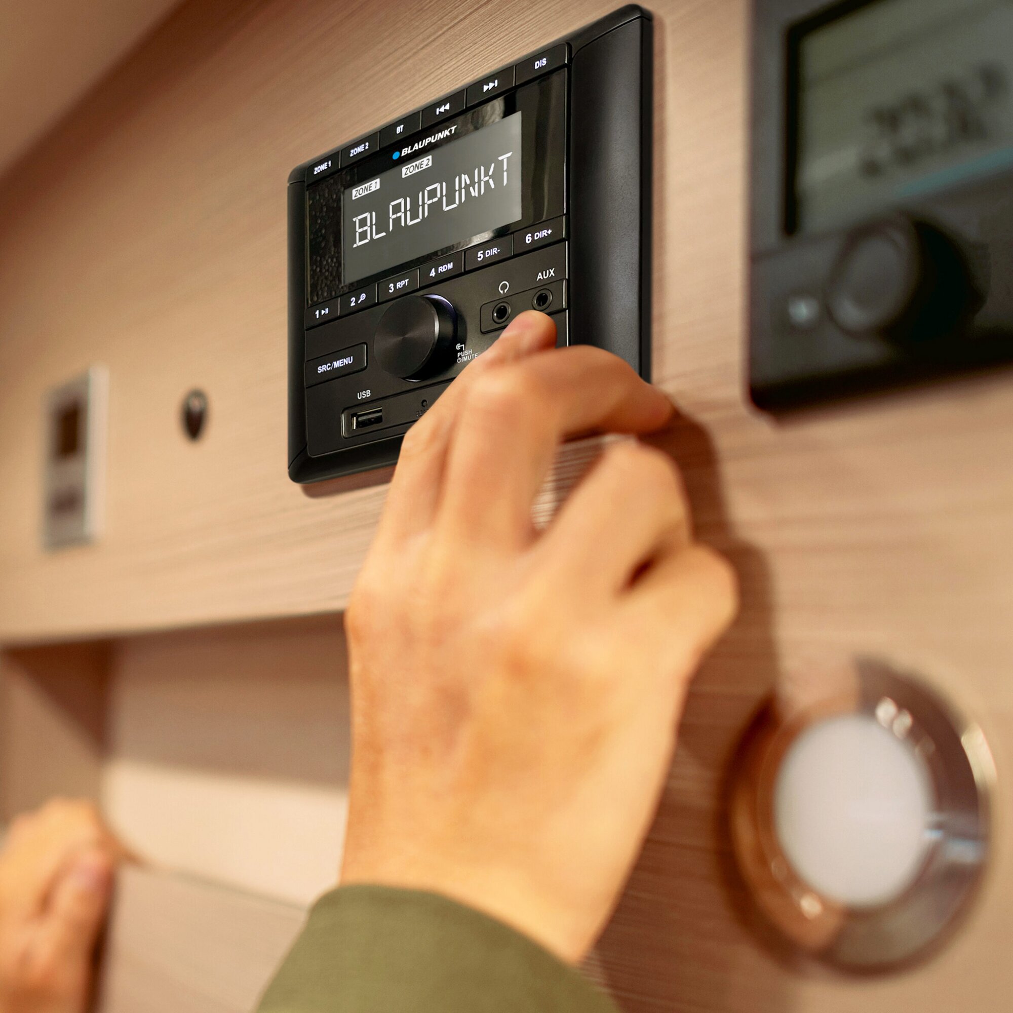Dieses Radio sorgt für eine nahtlose Multimedia-Verbindung im Wohnwagen und Reisemobil. Es ist mit einem High-End FM- und AM-Tuner sowie DAB+-Empfang ausgestattet. Die Audio-Zentrale vermittelt Signale vom Tablet, Laptop, Smartphone, MP3-Player sowie USB-Stick an das passende Ausgabegerät im Reisemobil – ob Fernseher, Bluetooth-Speaker, Kopfhörer, eingebaute Lautsprecher oder externer Verstärker. Innerhalb des Fahrzeugs kann die Lautstärke der angeschlossenen Lautsprecher bzw. der Lautsprecher über einen angeschlossenen externen Verstärker für die verschiedenen Zonen getrennt geregelt werden. Die maximale Ausgangsleistung liegt bei 4 x 40 Watt. Zusätzlich steht eine Bluetooth-Verbindung zur Verfügung, die das Signal nicht nur empfängt, sondern auch weitergibt. Im Lieferumfang ist eine Fernbedienung enthalten.