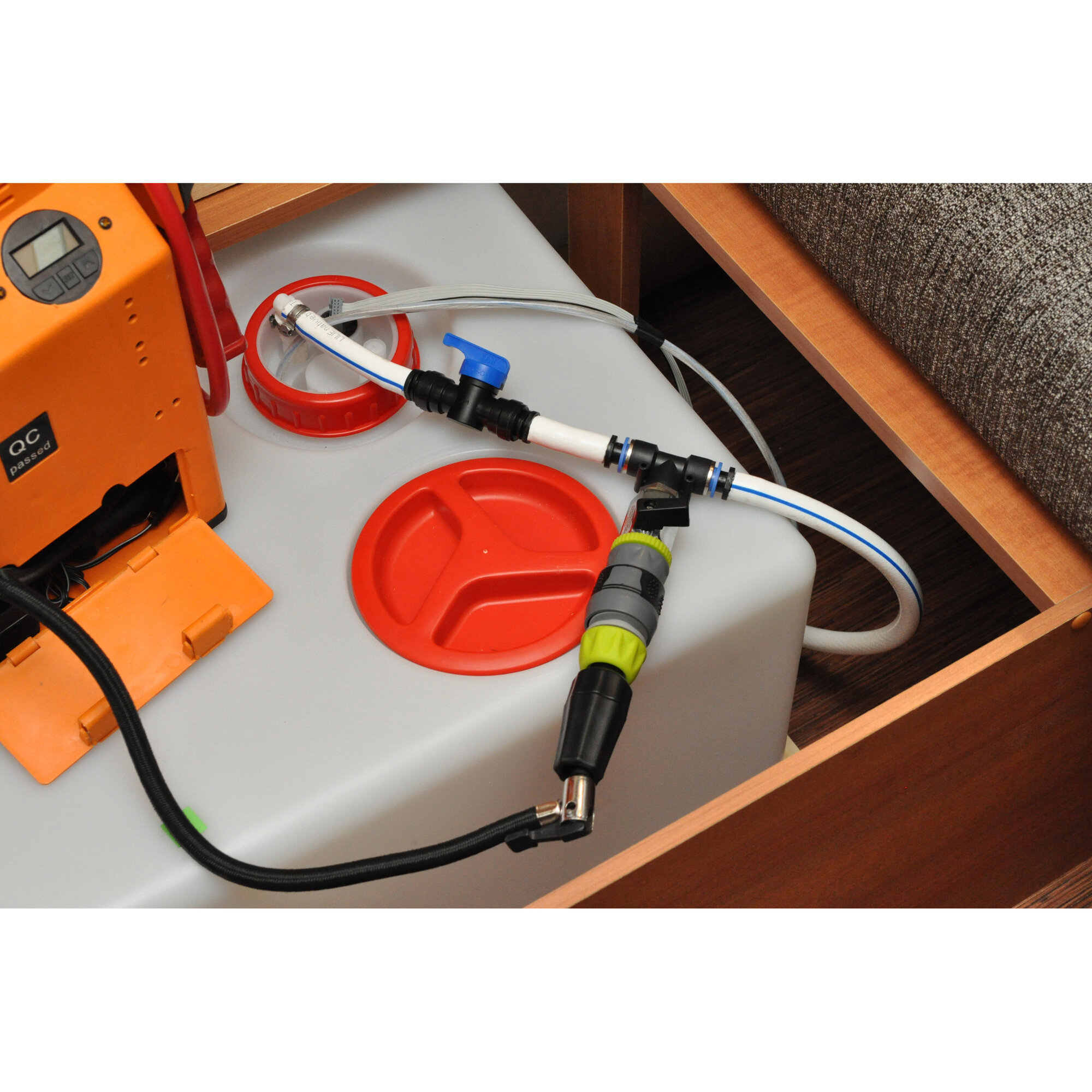 Floë ist ein einfach zu installierendes System, das Luft von einem Autokompressor oder einer Fußpumpe verwendet, um Ihnen die vollständige Entwässerung Ihres Wassersystems zu ermöglichen. So kann Wasser nicht stagnieren und potenziell gefährliche Krankheiten verursachen. Durch die Entleerung im Winter werden auch Frostschäden verhindert. Ein einfacher Prozess, der eine längere Benutzung des Fahrzeuges während der Wintermonate ermöglicht.