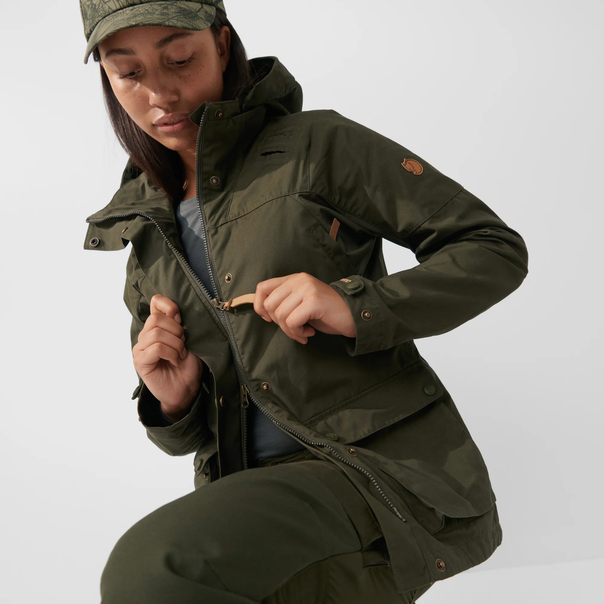 - Große, von oben zugängliche Balgtaschen mit Klappen und Knopfverschluss auf der unteren Vorderseite