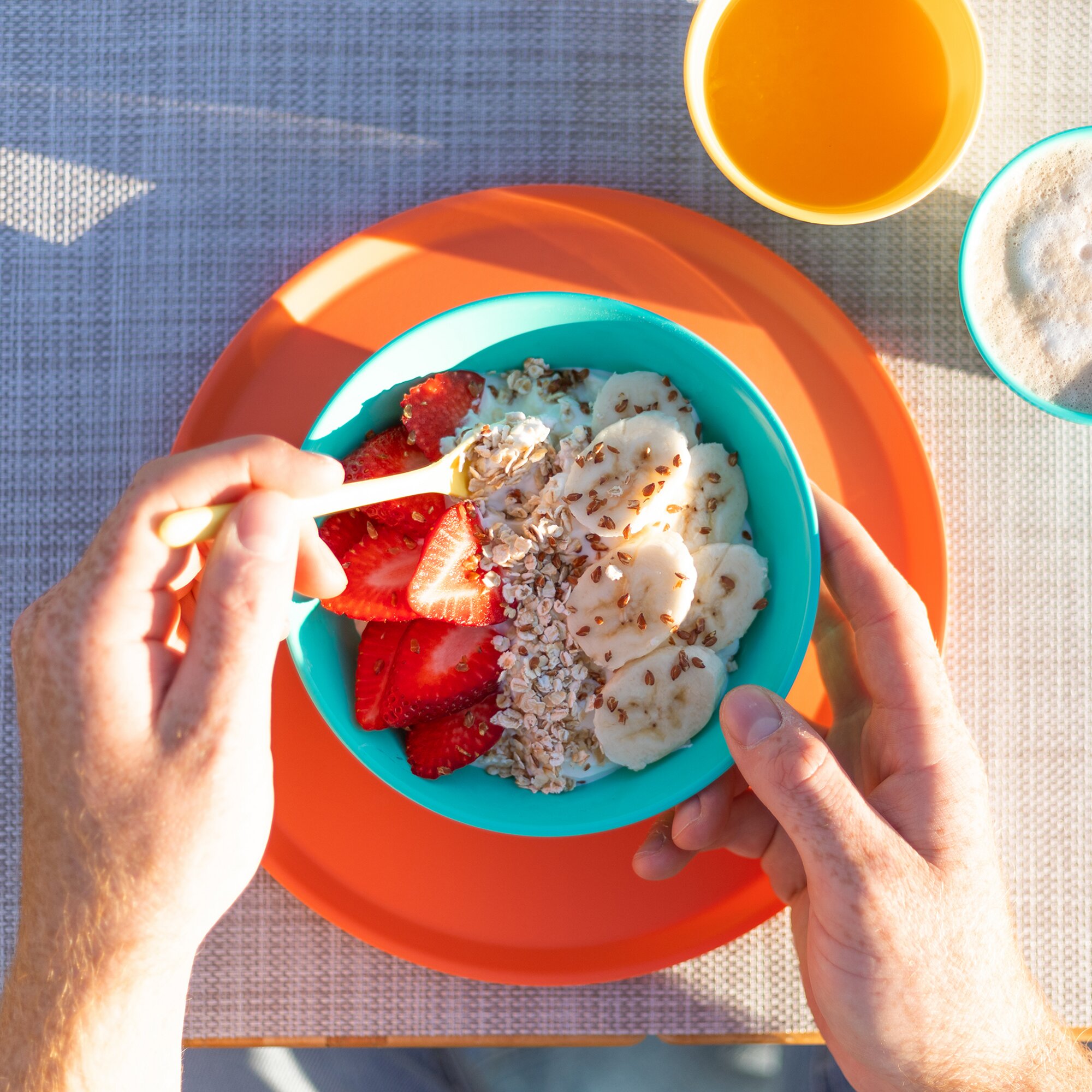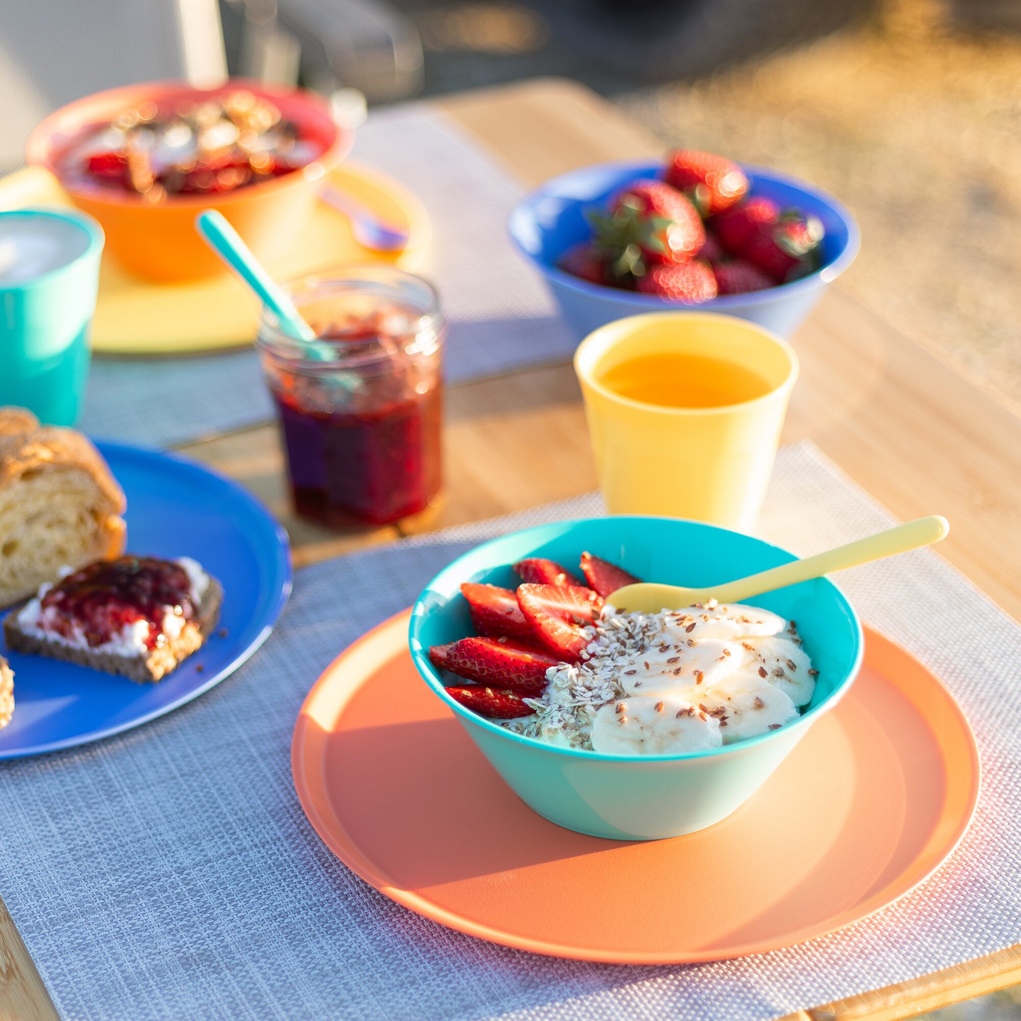 Lebensfreude pur – die Becher, Schalen, Teller und Löffel lassen sich nach Herzenslust kombinieren. Der kleine Teller ist ideal für Obst, Snacks oder Kuchen und die kleine Schale macht sich für Müsli oder Desserts schnell unentbehrlich. Der kleine Becher hat eine angenehme Haptik und liegt sehr gut in der Hand. Alles ist stapelbar, leicht und bruchsicher und damit perfekt geeignet für Gartenfeste, Picknicks und Camping. Das Material ist umweltfreundlich und absolut frei von Melamin und Bambus.