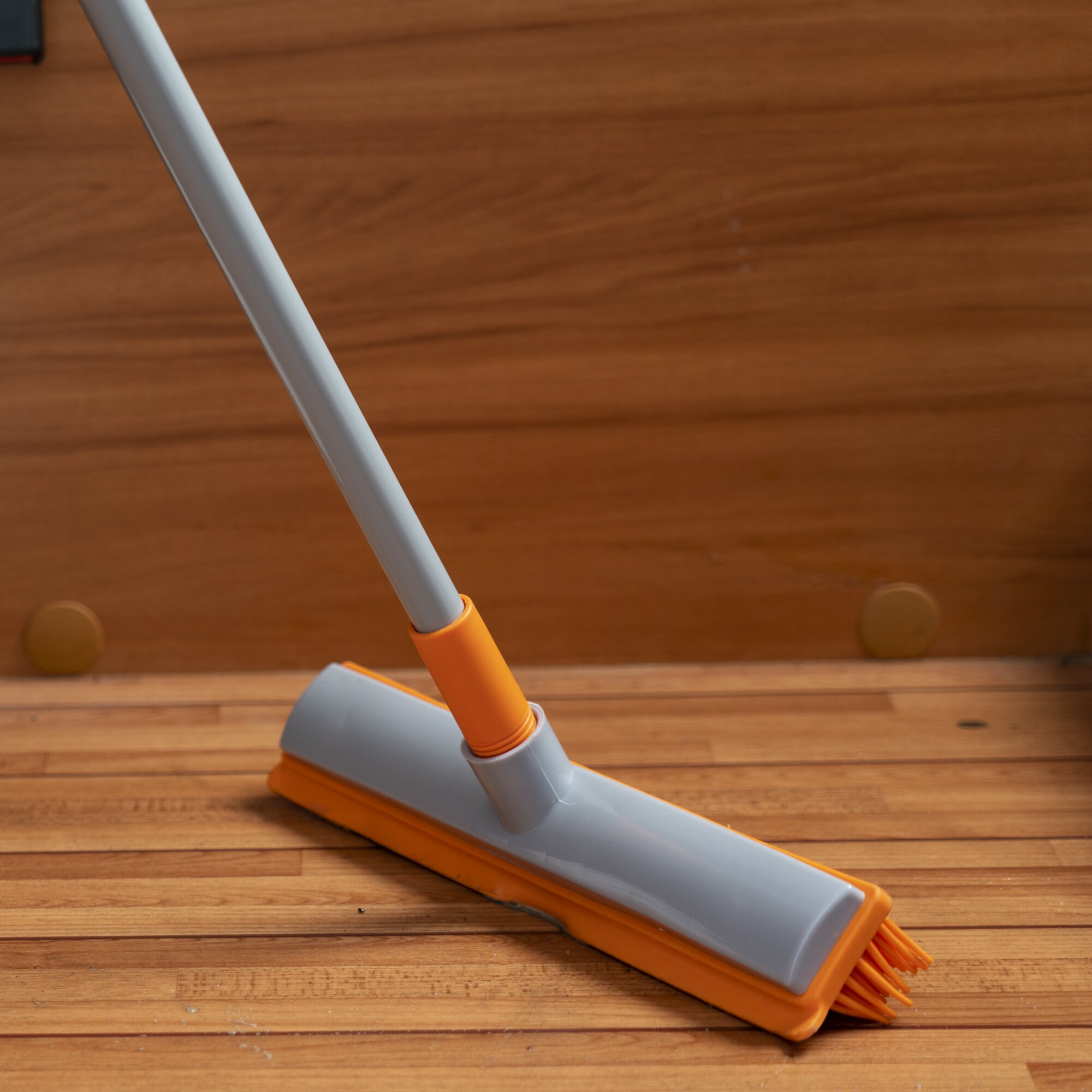 Kunststoff-Besen mit synthetischen Gummiborsten und Wasserabziehkante. Arbeitsbreite: ca. 31 cm. Inkl. Teleskopstiel (ca. 75 – 130 cm) mit drehbarer Aufhängekappe. Effektiv zum Entfernen von Haaren, Staub und Schmutz, für Nass- und Trockenreinigung.