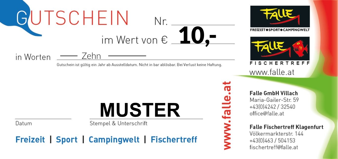 Einkaufsgutschein der Falle GmbH, einlösbar in Villach und Klagenfurt. Wählen Sie zwischen 10 €, 20 €, 50 €, und 100 € und bei Bestellabschluss die gewünschte Versandart.