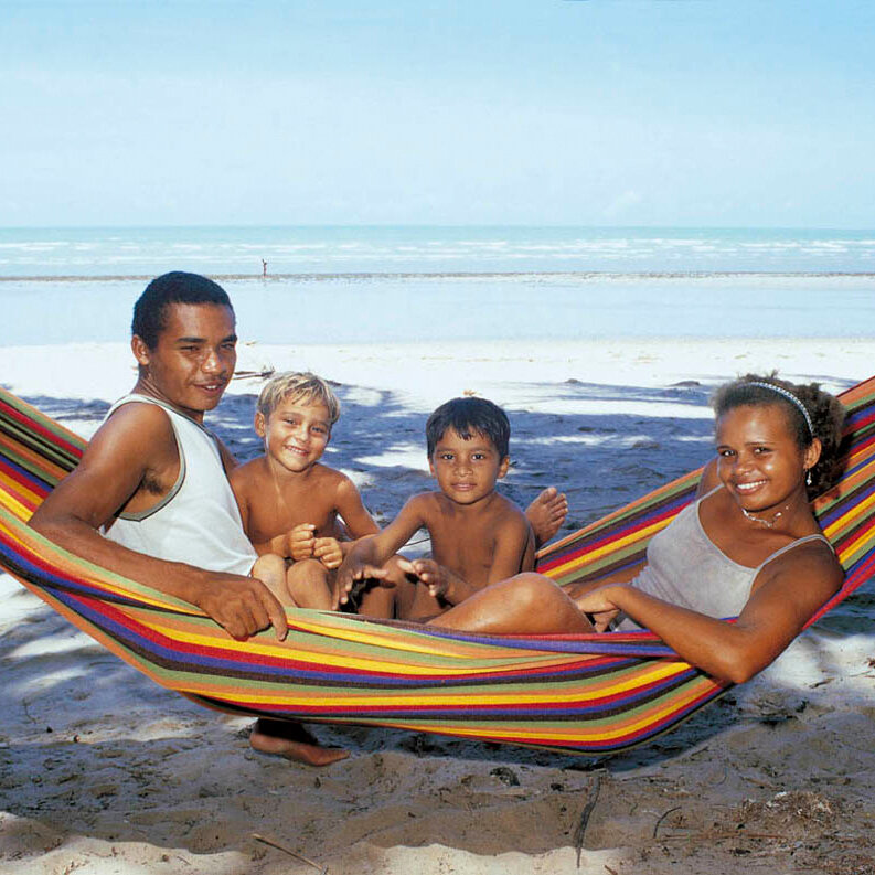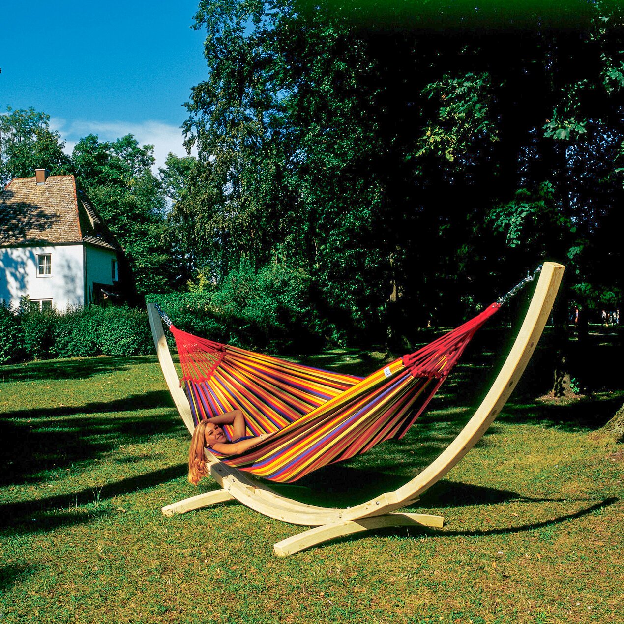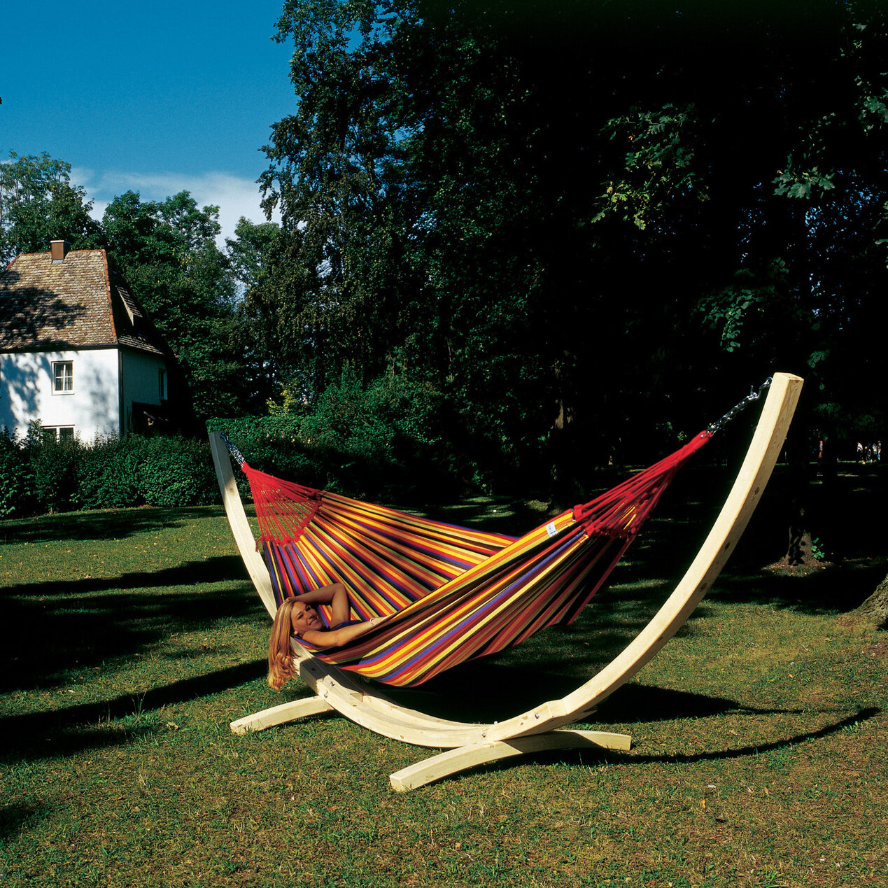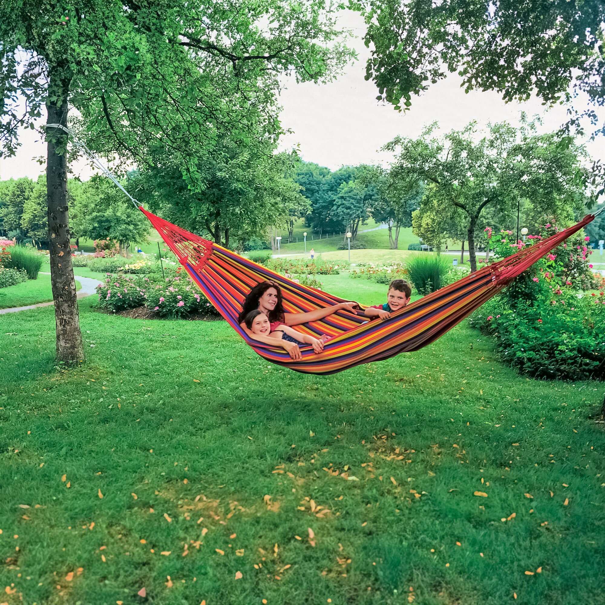 Paradiso ist höchster brasilianischer Hängemattenkomfort und etwas ganz Besonderes: Nur wenige Webstühle sind geeignet, ein 1,75 m breites Tuch herzustellen. Um diese riesige Hängematte gleichzeitig extrastabil und superweich zu bekommen, werden knapp 5000 Fäden miteinander verwoben! Die extradicken Schnüre verbindet Amazonas nochmal per Handarbeit mit einem Webband, damit auch hohe punktuelle Belastungen ausgeglichen werden, was der Matte eine sehr hohe Lebensdauer verleiht.