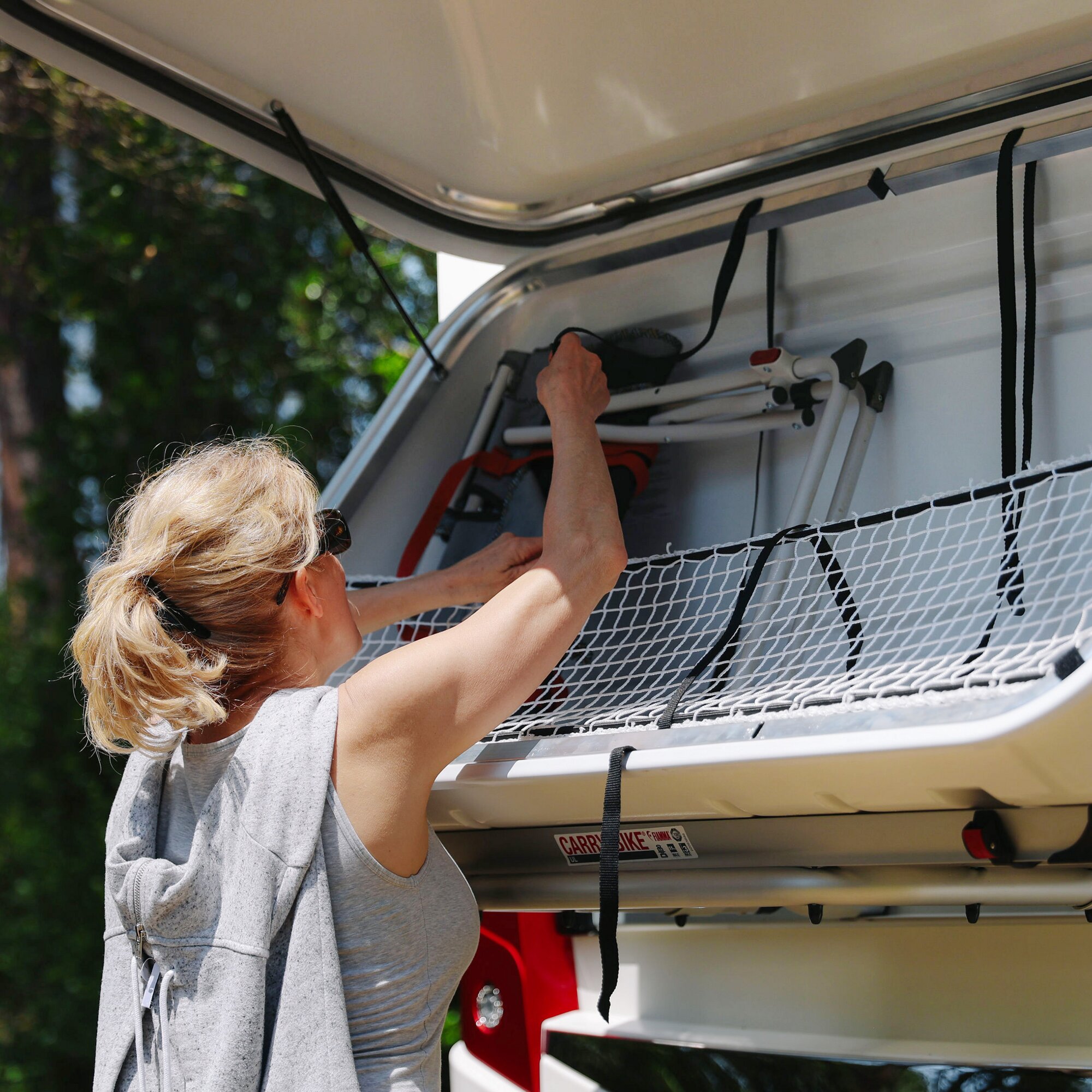 Gepäckboxen aus hochwertigem ABS-Plus für Wohnmobile und Kleinbusse. Stoßfest und witterungsbeständig, UV-beständig. Starkwandiger, alterungsbeständiger Kunststoff. Mit Edelstahlscharnieren und Aluminiumprofilen. Mit Dichtungen, damit während der Fahrt kein Wasser eintritt. Montage auf Carry-Bikes mit beiliegendem Montagekit. GS/TÜV-Zulassung. Mit elastischem Netz zum Festhalten des Gepäcks.