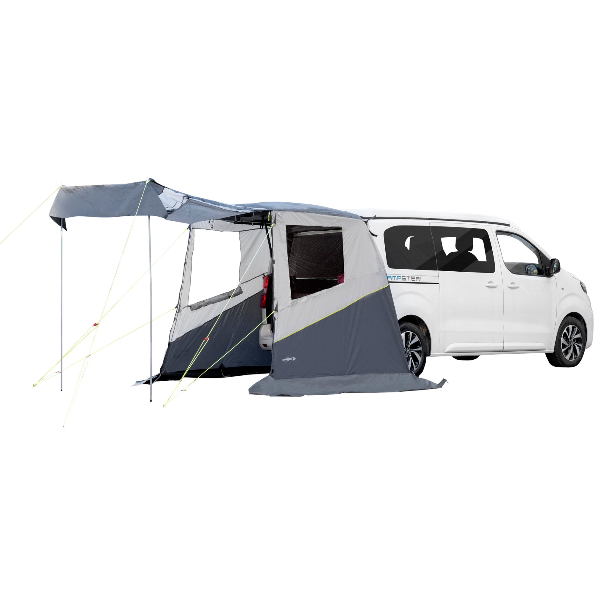 Das rahmenlose Heckklappenzelt passt an verschiedene baugleiche Fahrzeugmodelle: Peugeot Traveller, Citroën Spacetourer und Toyota Proace. Schnelle und einfache Montage ohne Werkzeug mit Magnetstreifen und Gurten. Sehr windstabil dank Abspanngurten. Der außenliegende Faulstreifen hält Regenwasser fern. Inkl. 30 cm Kunststoffheringen und Packtasche. Der Fahrradträger kann auf der Heckklappe montiert bleiben. Hochrollbare Vorderwand und Seitenwände mit Fenstern und Verdunkelung. Inklusive 2 Aufstellstangen.