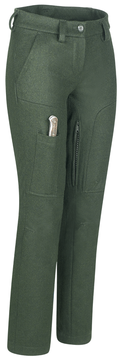 Damen aufgepasst! Die schlanke Jagdhose mit vorverlegten Seitennähten bringt eine schmale Optik am Vorderbein während die schräg abfallenden Quernähte lange Beine betonen. Die Hose ist im gesamten Verlauf schmal geschnitten. Das vorgeformte Knie bietet ausreichend Bewegungsfreiheit, die Saumweite nimmt Rücksicht auf feste Bergschuhe. Rechts ist eine Messertasche aufgesetzt, links eine praktische Schenkeltasche mit viel Volumen, jedoch ohne aufzutragen. Belüftungszonen runden das Gesamtkonzept ab und sorgen für ein optimales Körperklima.