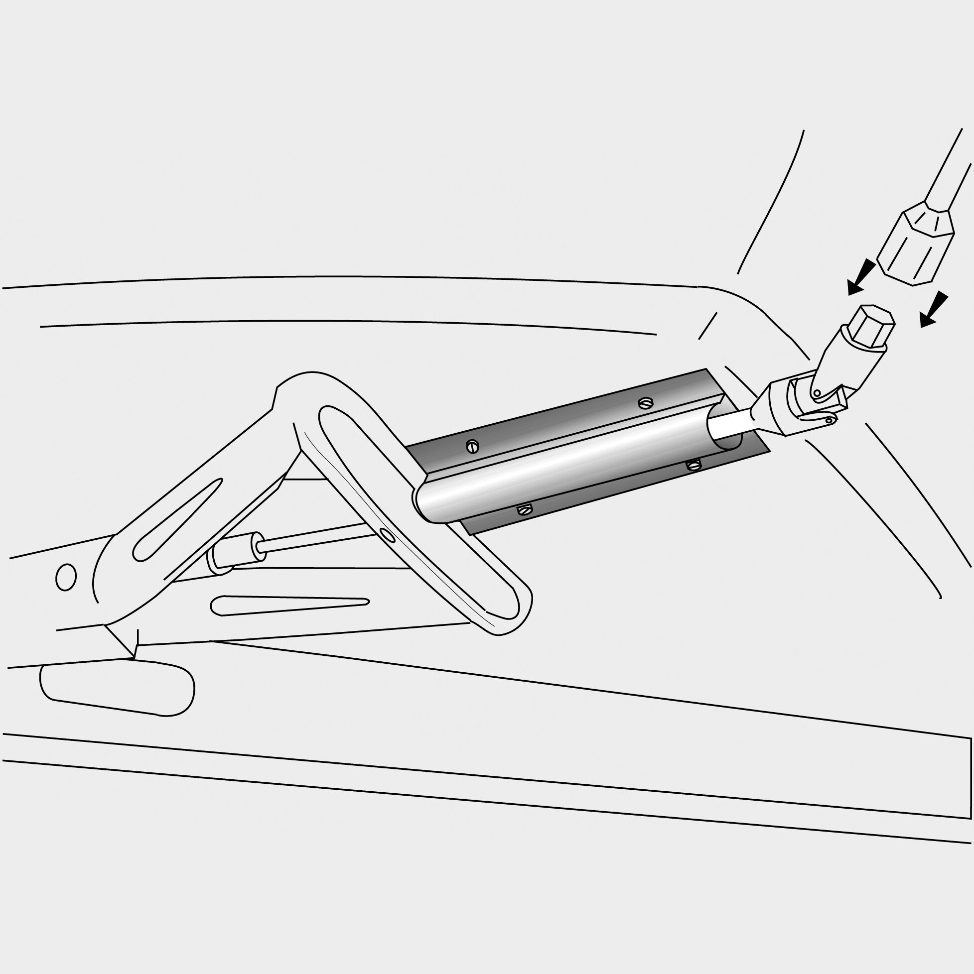 Der Anbaubereich für das Kunststoffprofil am Boden muss frei sein, d. h. ohne Leitungen und sonstige Bauteile. Bei Fahrzeugen mit Außenschürze ist eine Bohrung in der Schürze vorzusehen. Die 4 Kunststoffprofile werden nach Bedarf auf Länge gesägt und anschließend mit Holzschrauben am Boden als Kurbelführung befestigt.