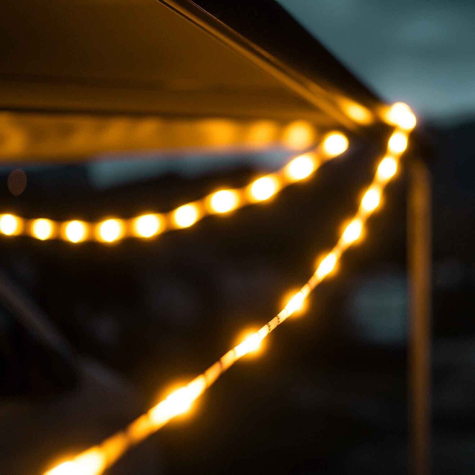 Das Leuchttau kombiniert warmweißes Licht mit hoher Funktionalität. Mit 150 kg Belastbarkeit und wetterfestem Material eignet es sich zum Abspannen von Markisen oder als Wäscheleine. Das 6 m lange LED-Tau ist stufenlos dimmbar und wird per USB-C betrieben. Inkl. Drybag zur Aufbewahrung oder zum Schutz einer Powerbank.