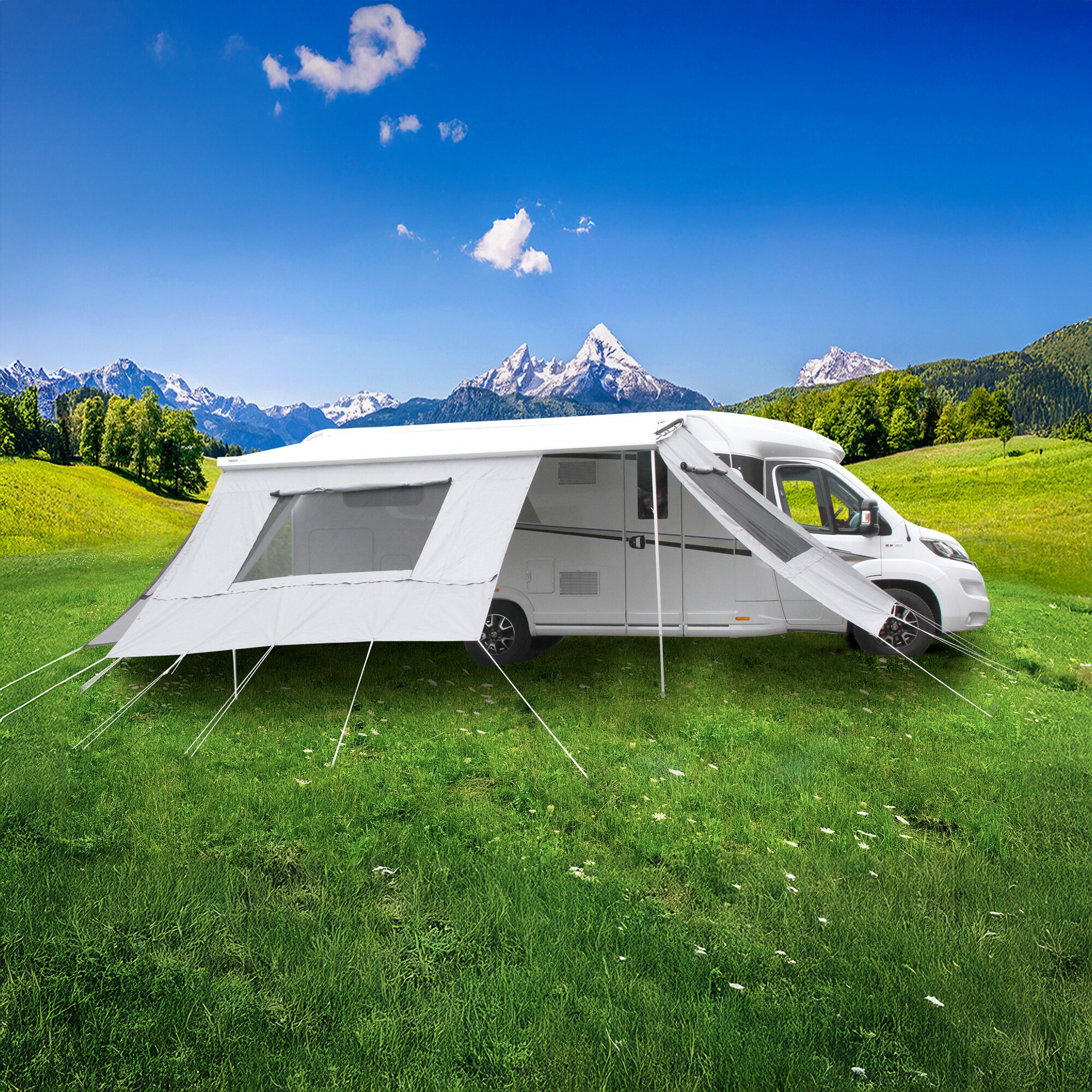 Die flexible und leichte Camper Lounge schafft im Handumdrehen mehr Raum, Schutz und Privatsphäre. Der werkzeugfreie Auf- und Abbau gelingt schnell, ideal für spontane Stopps. Das System umfasst zwei Seitenteile und ein Frontteil, das über den Keder in die Markisenleiste geschoben wird. Die Seitenteile lassen sich flexibel an Rafterstange (optional) oder Gelenkarm befestigen. Leinen, Heringe und Flatterstopp sind inklusive. Die Camper Lounge bietet zuverlässigen Schutz bei Sonne, Wind und leichtem Regen. Verschließbare Panoramafenster sorgen für Belüftung und Ausblick. Passend für Markisen mit 2,5 m Auszug und 3 m Breite – ideal für Wohnmobile.