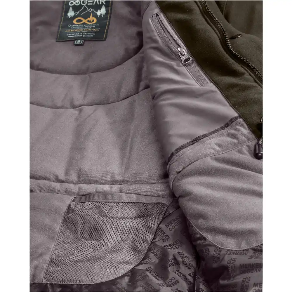 Im Inneren der Jacke finden sich zwei sehr große Seitentaschen, die mittels lautlosen Zippern zu schließen sind. Zwei Mesh-Einschubtaschen für optionale Wärmepads sitzen auf Höhe der Nieren. Den mit 37.5®-Partikeln ausgerüsteten Oberstoff des Parkas bildet geräuscharmes, aufgerautes Mikro-Trikot. Im Inneren der Jacke sowie im Inneren der Kapuze sorgt eben dieses Material für ein angenehmes Gefühl auf der Haut. Das restliche Innenleben ist aus gutgleitendem Tafetta gearbeitet und mit einer dezenten MerkelGEAR-Ornamentik verziert.
