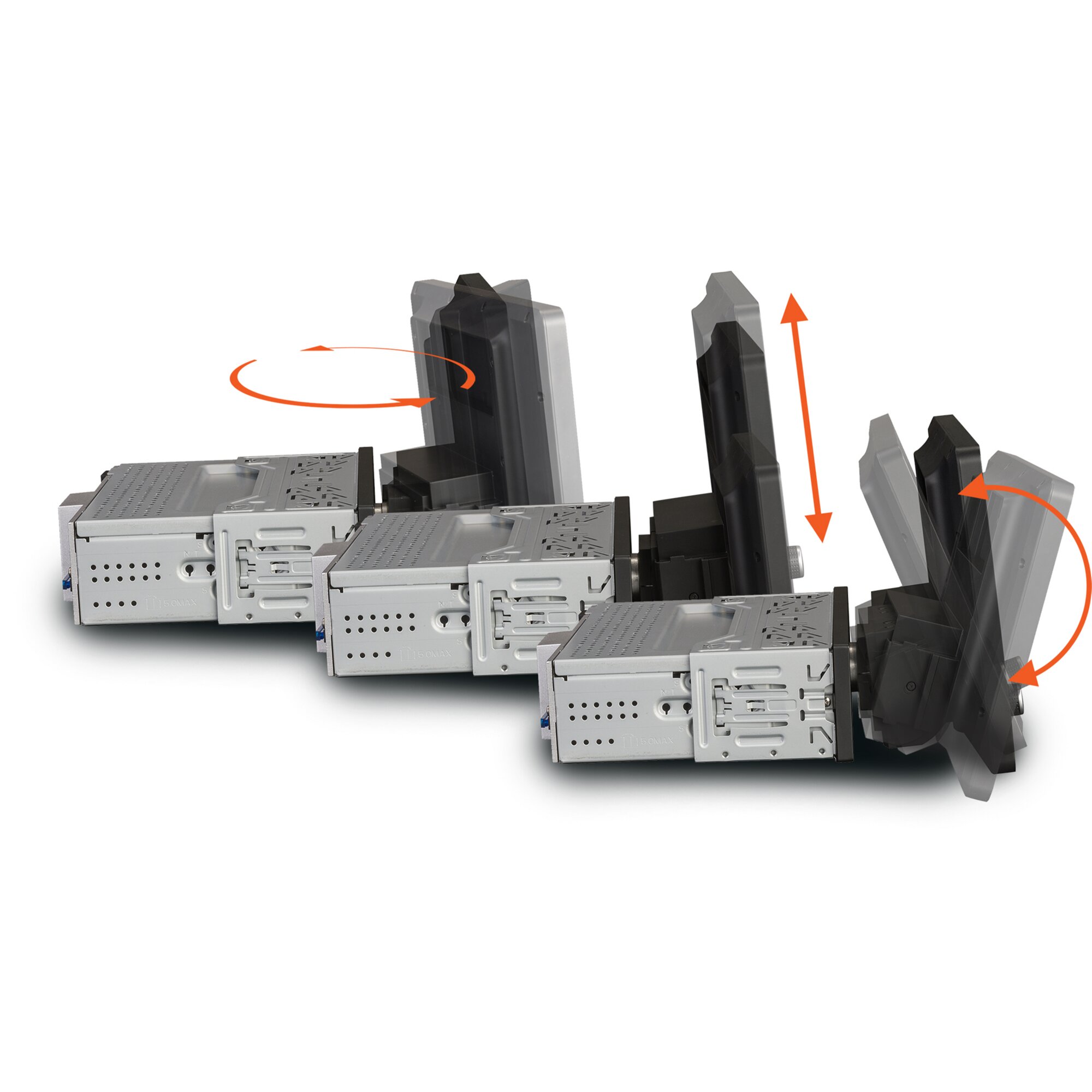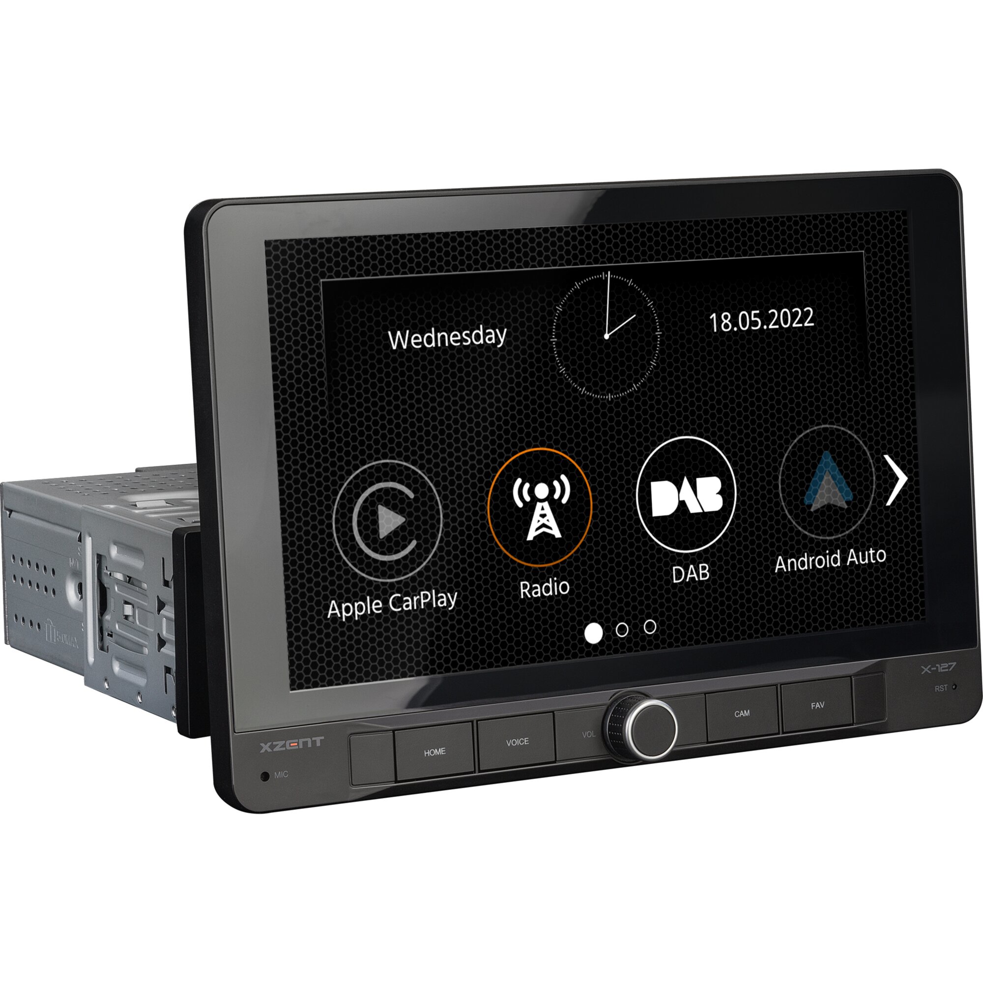 Großer kapazitiver 9“/22,9 cm Echtglas-Touch-screen mit 4 Bedientasten. Für Fahrzeuge mit 1-DIN Einbauschacht. Damit sich der X-127 optimal ins Cockpit integriert, lassen sich die vertikale Position des Bildschirms in seiner Höhe sowie der horizontale und vertikale Neigungswinkel über eine flexible Einstellmechanik anpassen.