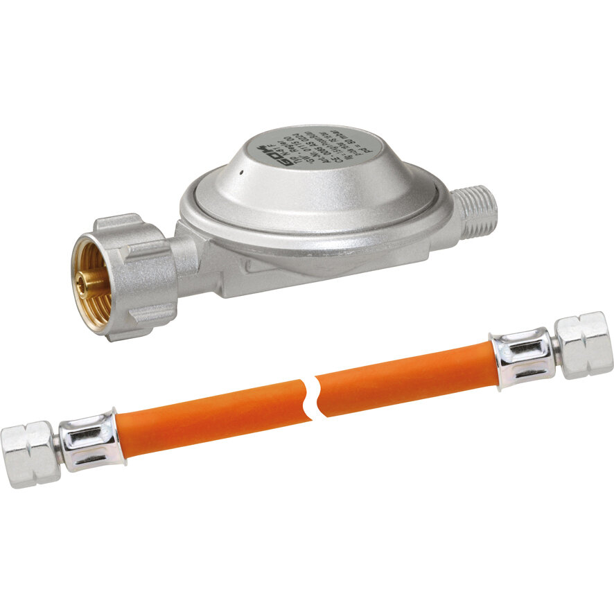 Beinhaltet einen Niederdruckregler Typ EN61 ohne Manometer; 1,5 kg/h, 50 mbar und Kunststoff-Schlauchleitung Mitteldruck 400 mm bis -20 °C, beidseitig G ¼ Linksgewinde-Überwurfmutter sowie ein MiniTool.