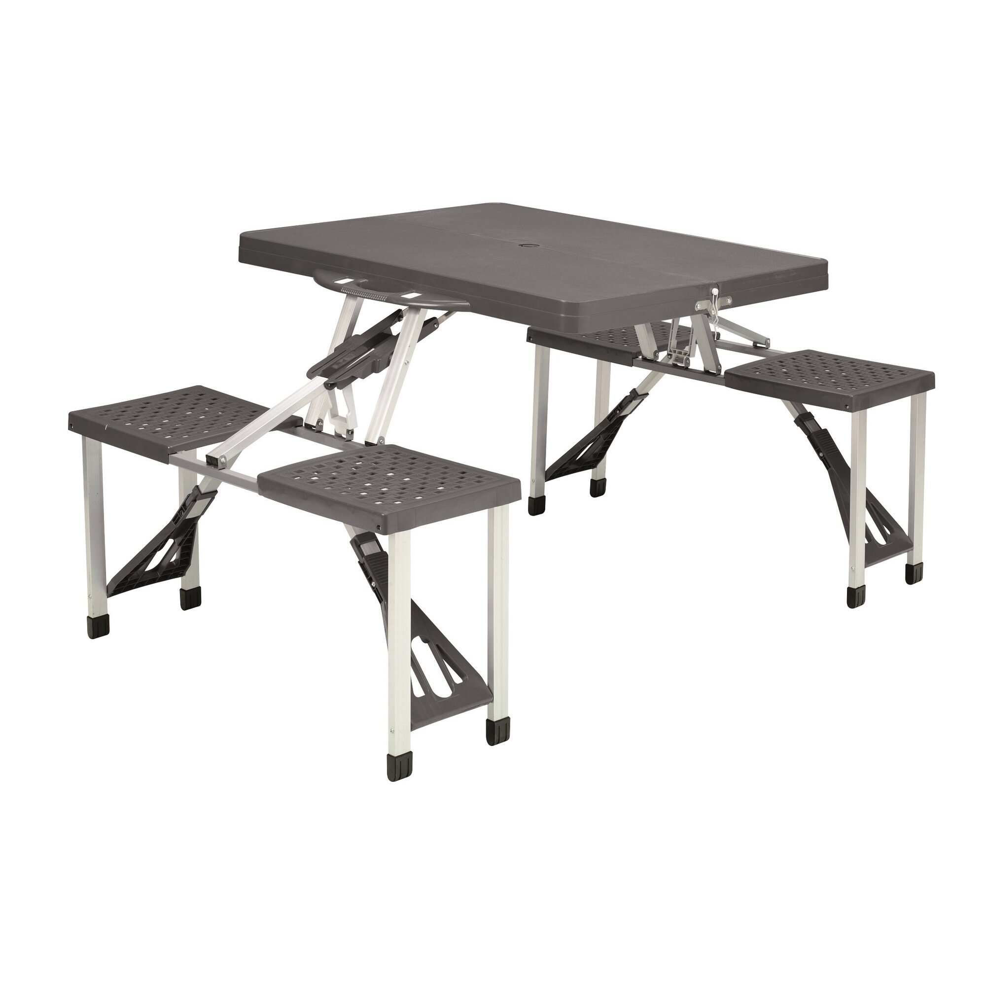 Mit dem extrem stabilen Picknickset sind Sie für jeden Campingurlaub, jede Sportveranstaltung und jede Party gerüstet. Der kompakte Klapptisch mit 2 Sitzbänken für vier Personen ist immer dabei. Ideal für Garten, Strand, Camping oder Kinderparty. Sitze aus Polypropylen mit Korb-Webmuster in der gleichen Farbe wie die ABS-Kunststofftischplatte. Der Rahmen ist aus Aluminiumlegierung für eine lange Lebensdauer. Der Picknicktisch Toulouse ist ideal für den Outdoor- oder Innenbereich. Der Tisch hat in der Mitte ein Loch, um einen Sonnenschirm aufzunehmen. Tischplatte: 84 x 64 cm. Belastbarkeit: Tisch: 50 kg, Bank: je 100 kg.
