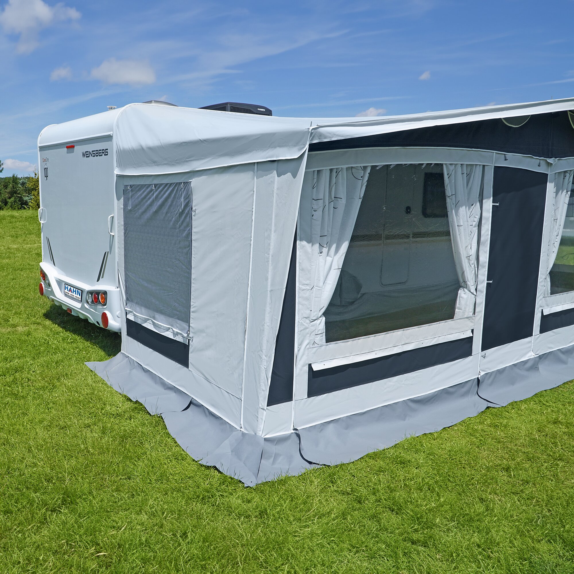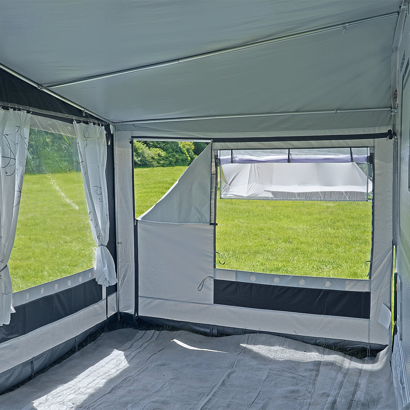 Seitenwände: mit klaren Folienfenstern mit Prägefolienabdeckung und Fliegengaze, Gardinen mit Rollaufhängung und Hohlsäumen unter den Fenstern.