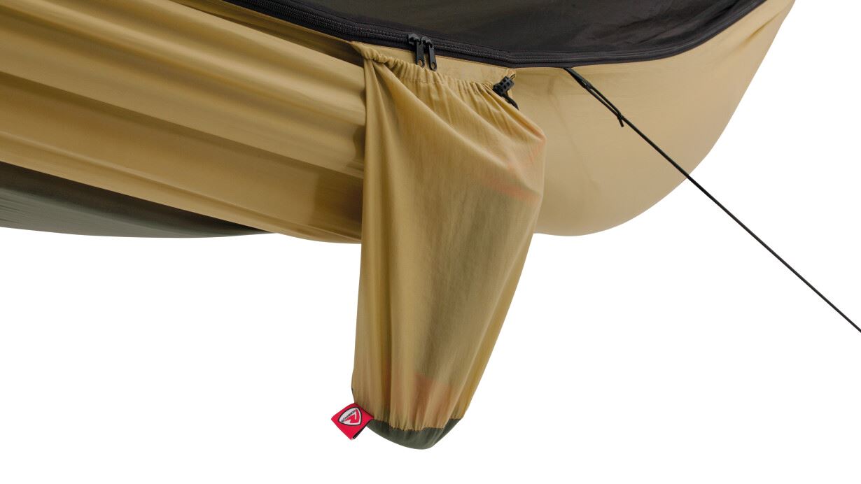 Robens' Versprechen: Hängematte: 100% recyceltes Nylon (ausgenommen Gurtband und Besatz), Moskitonetz: 100% recyceltes Polyester (ausgenommen Gurtband und Besatz)