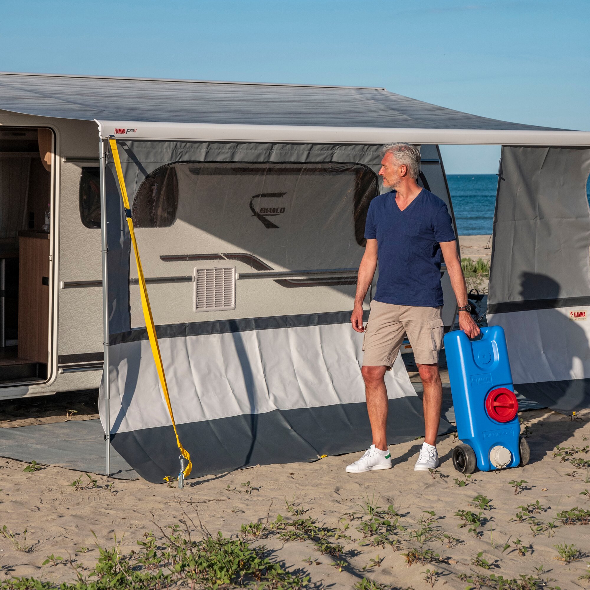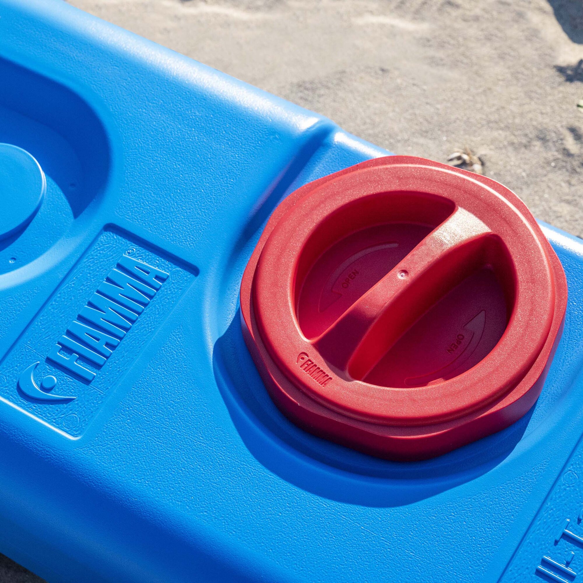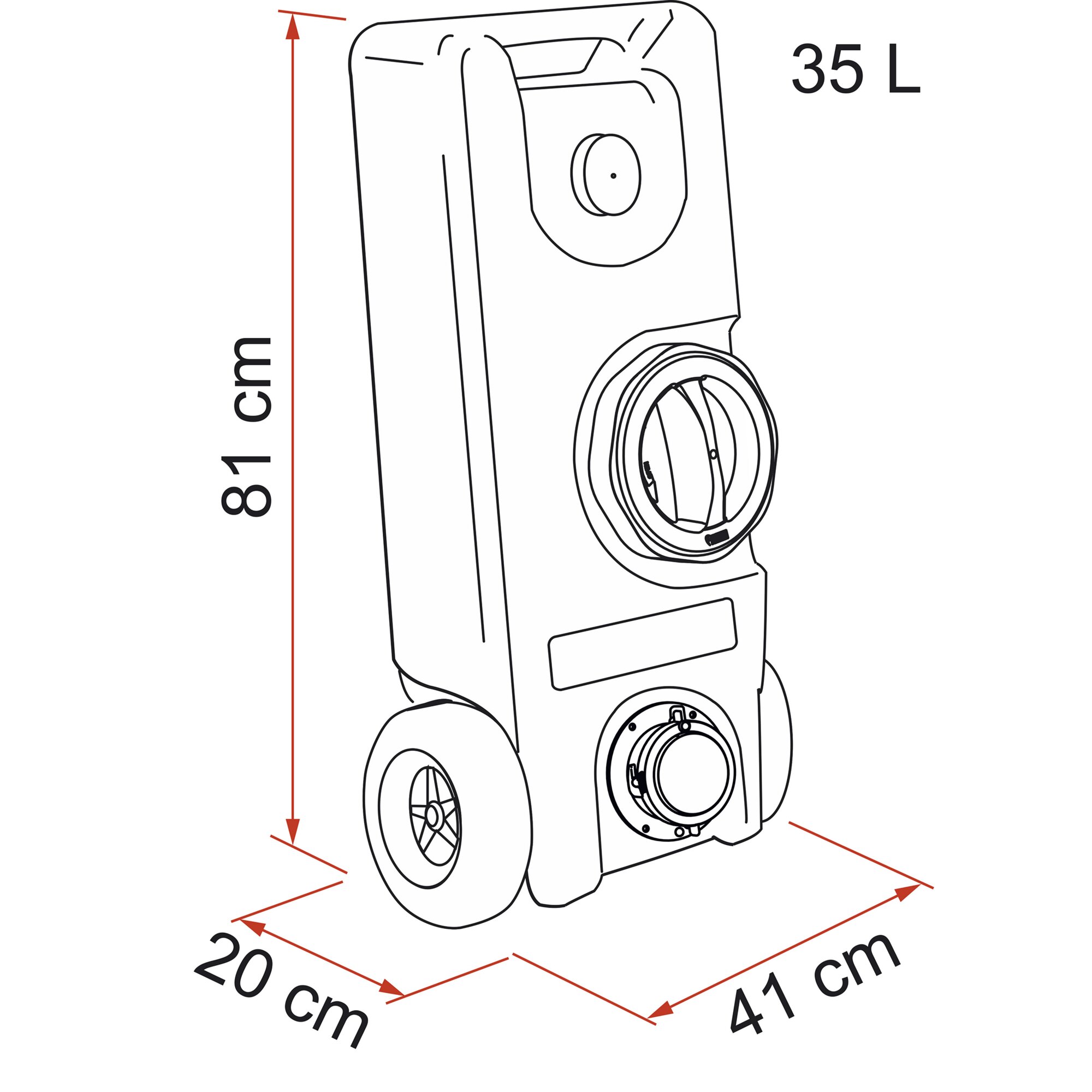 Frischwassertank mit einem eingelassenen, bequemen Griff und zwei massiven Rollen für den einfachen Transport auch auf unebenen Flächen. Aus atoxischem Kunststoff hergestellt. Große Reinigungsöffnung. Deckel mit Bajonettverschluss und Schlauchanschluss, zum Befüllen des Kanisters, auch als Zubehör erhältlich.