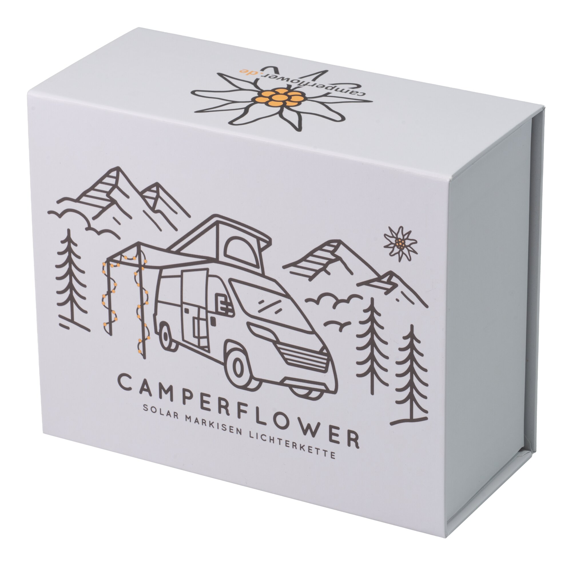 Die Camperflower Solar Markisen Lichterkette bringt stimmungsvolles Licht beim Camping – ganz ohne Stromanschluss. Das große Solarpanel mit Clip wird direkt an die Markise befestigt und sorgt dank effizienter Solartechnik für 6 – 8 Stunden Beleuchtung. Mit 10 m Länge, 100 warmweißen LEDs, vier Dimmstufen und flexibler Befestigung über Markisenhaken ist sie ideal für gemütliche Abende unterwegs. Inklusive Transportbox.