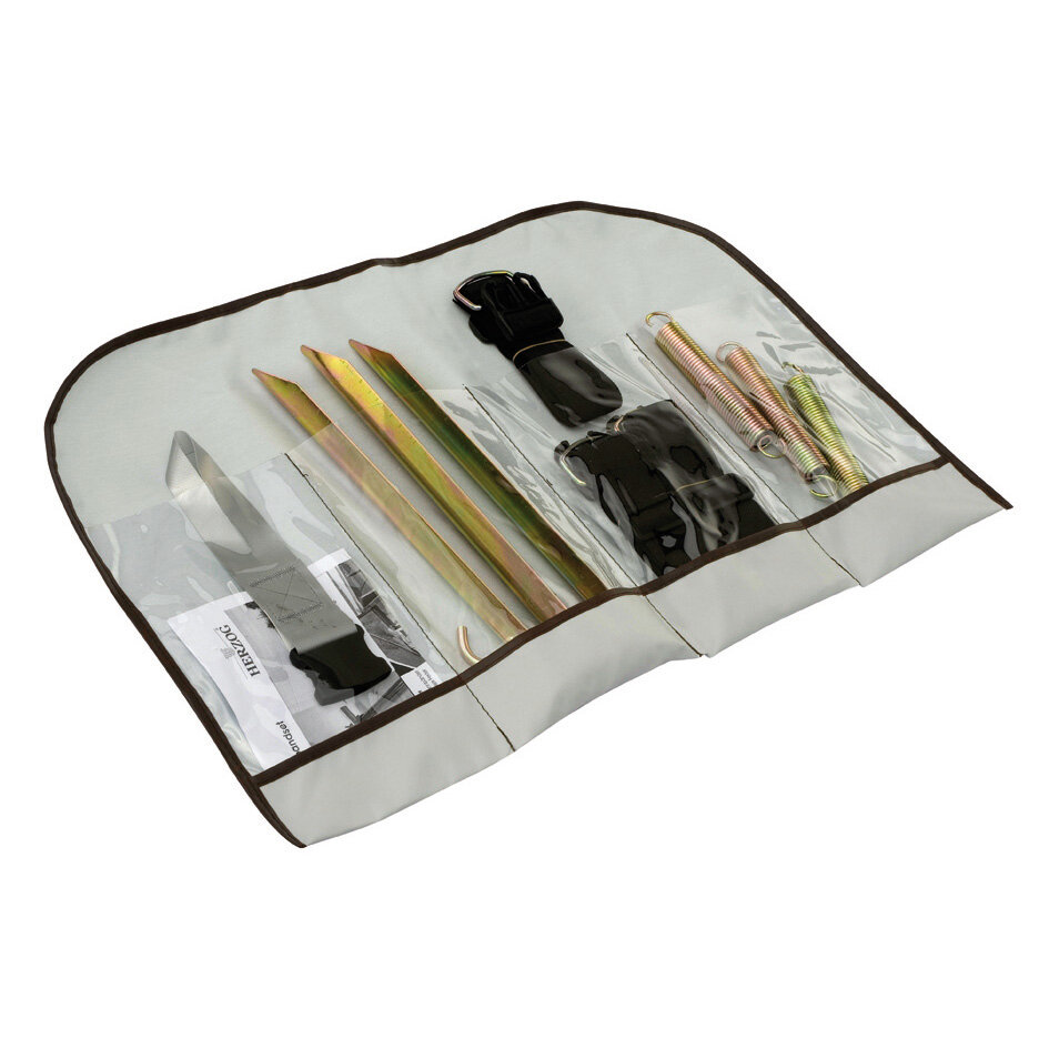 Bestehend aus: 3 Gurtbändern ca. 40 mm breit, mit Gurtclip; 3 verzinkten Spezial-Heringen ca. 38 cm lang; 3 Spiralfedern ø ca. 18 mm; Spannschlaufe mit Schließe.