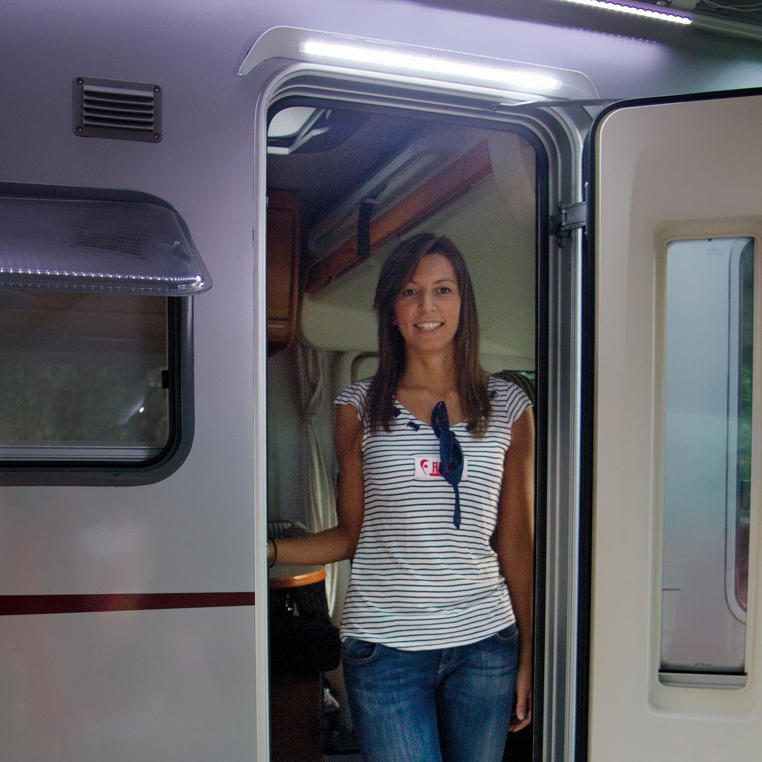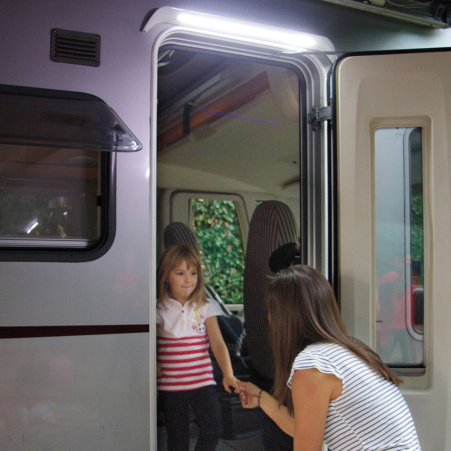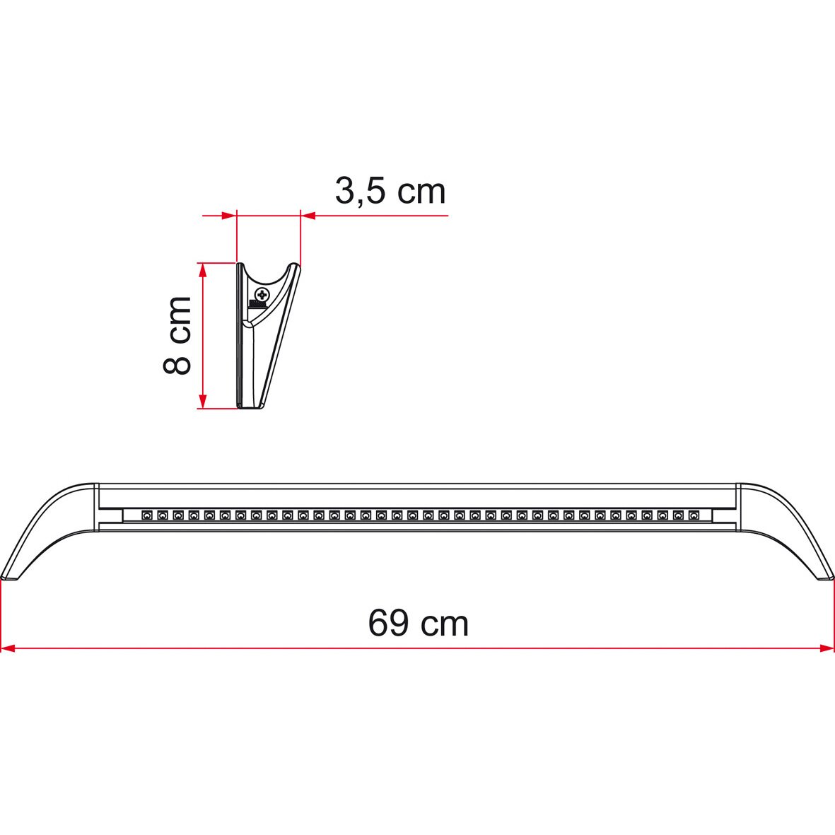 Innovative Version der klassischen LED Awning Light Leuchten für außen über der Tür von Fiamma. Diese Ausführung hat Endstücke in Form einer Regenrinne sowie eine Aushöhlung in der Mitte. LED-Anzahl: 30 Stück.