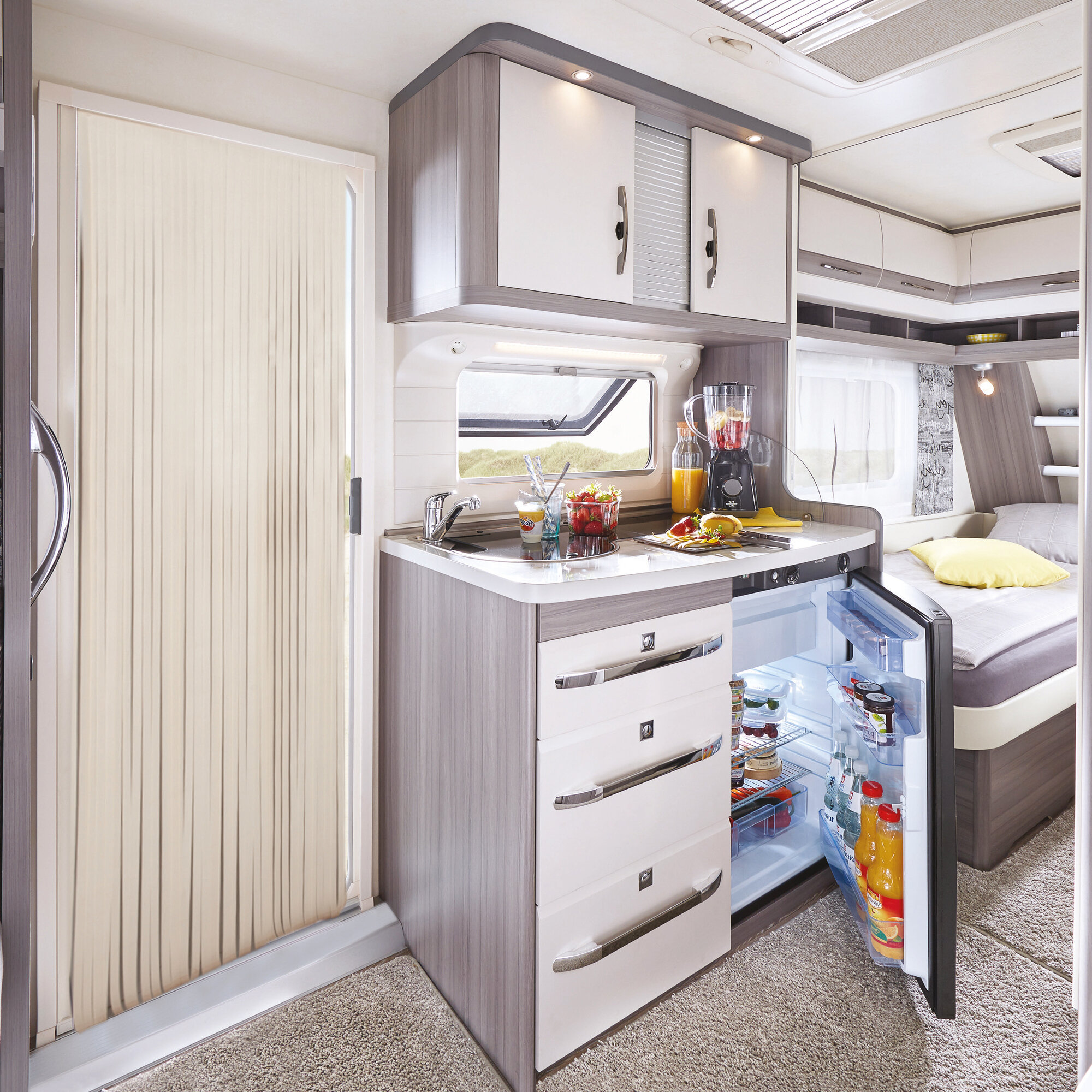 Eleganter Vorhang aus Kunstleder für Türen und Vorzelteingänge. Der Vorhang kann mit der Schere auf die gewünschte Länge gekürzt werden. In 2 Größen und 2 Farben für Wohnwagen, Reisemobil, Vorzelt und Haus. Inklusive Befestigungsmaterial und stabiler Vorhangstange aus PVC. Patentiertes Produkt.