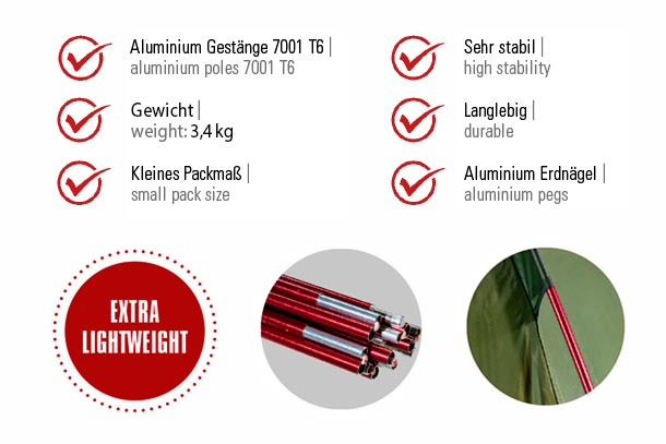 Gestänge geben dem Zelt eine hohe Windstabilität. Extra leichte und