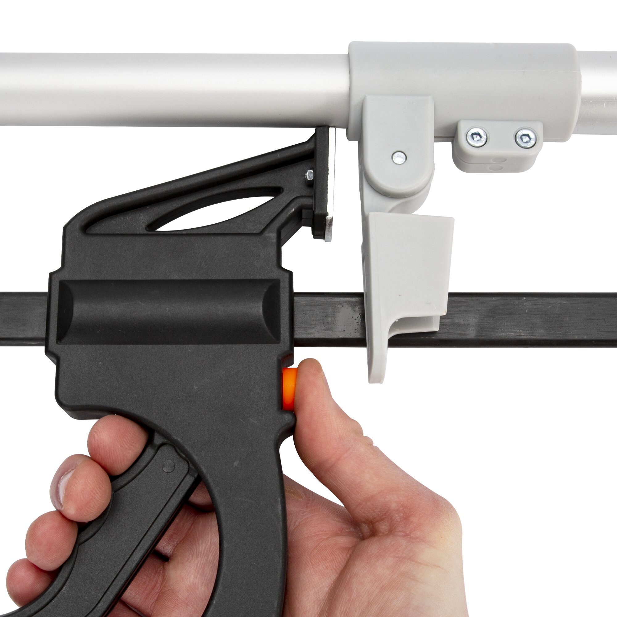 Gestängepistole für das einfache Ausspannen der Gestänge. Der Haken hängt sich in das Vorzelt-Gestänge und Sie können es ohne viel Kraftanstrengung auf die gewünschte Spannung bringen.