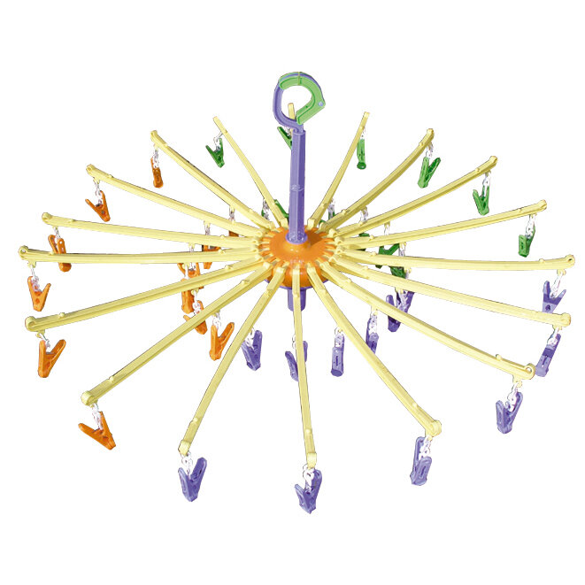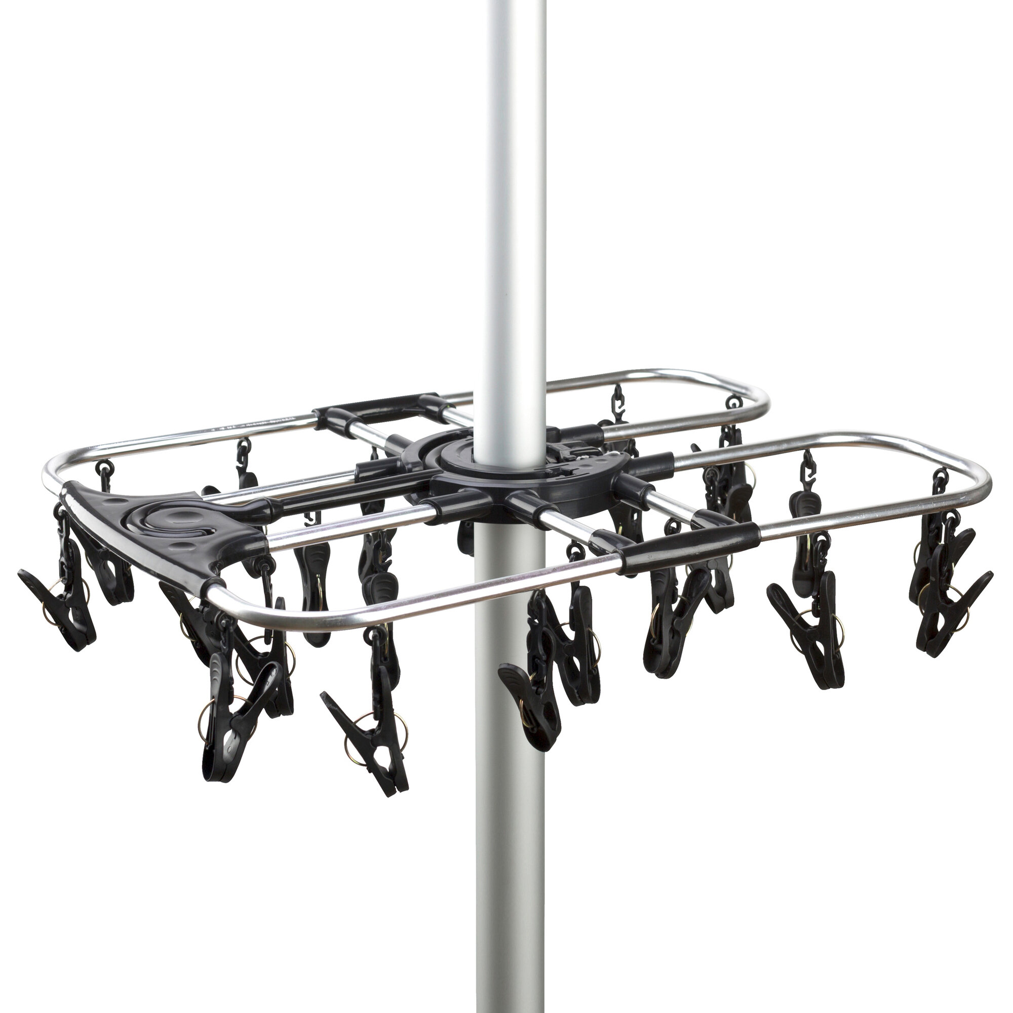 Passend für alle Rohre mit einem Durchmesser von 32 – 50 mm dank variabler Klemmvorrichtung und integriertem, stabilem Aufhänger. Mit 24 Wäscheklammern. Material: Alu-Rahmen mit Kunststoffelement.