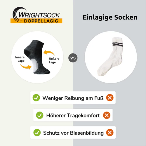 - Anti-Blasen-System: Bei den doppel-lagig konstruierten WRIGHTSOCK dringt Reibung nicht auf die Haut durch, weil sie zwischen der inneren und äußeren Sockenlage neutralisiert wird, während die Spezialfaser der inneren Lage für trockene Füße sorgt.